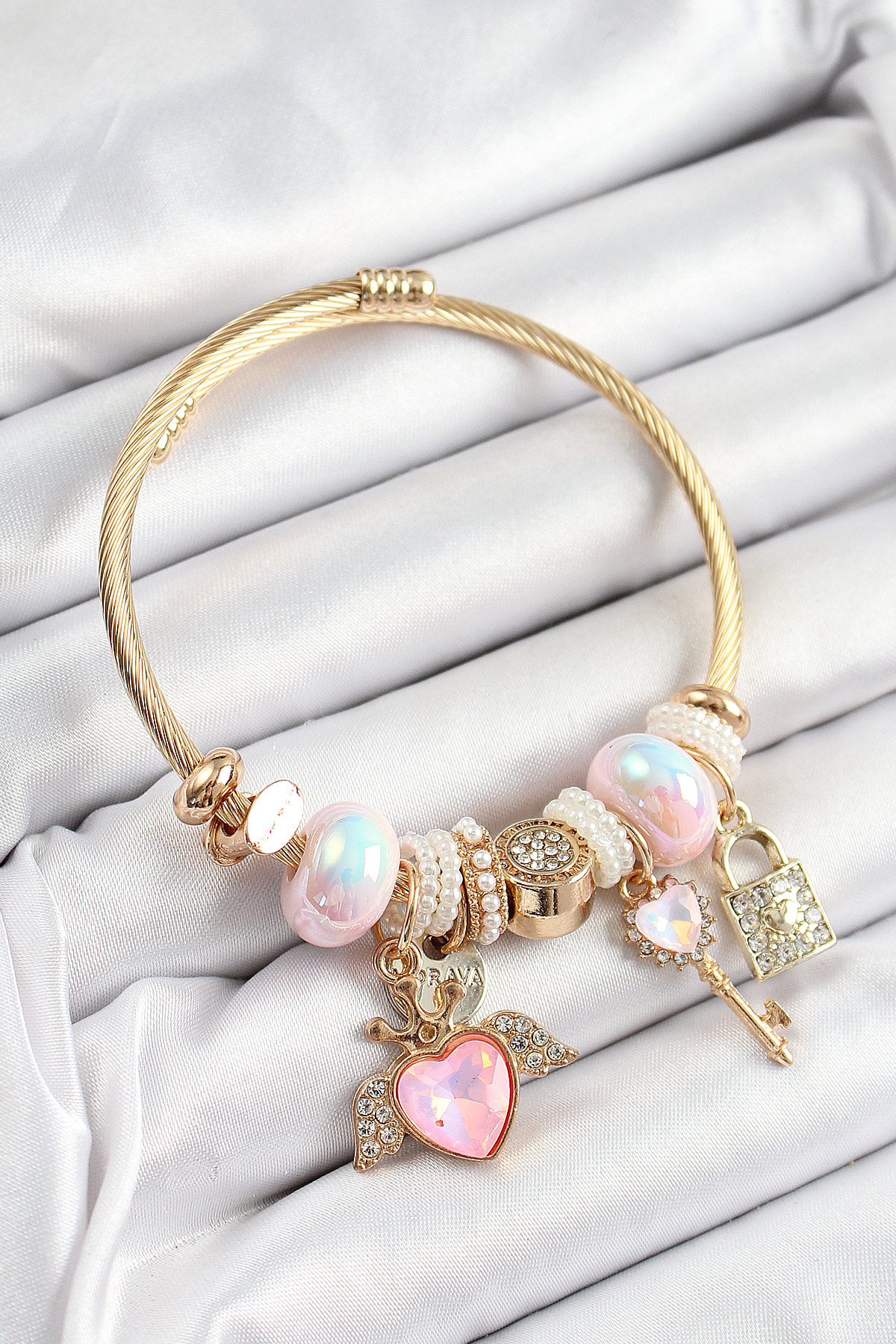 316L Çelik Pembe Zirkon Taşlı Kilit Anahtar Ve Kalp Model Gold Renk Charm BileklikCharm Bileklik - TJ-BB7296