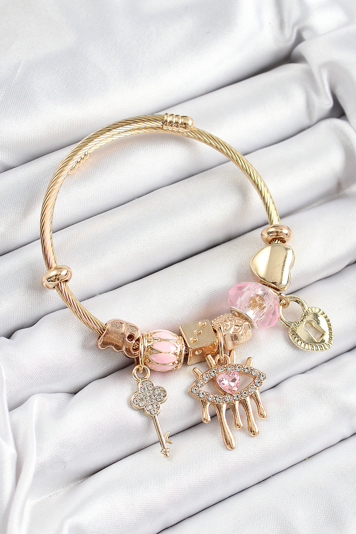316L Çelik Pembe Zirkon Taşlı Kilit Göz Ve Anahtar Model Gold Renk Charm Bileklik - TJ-BB7299
