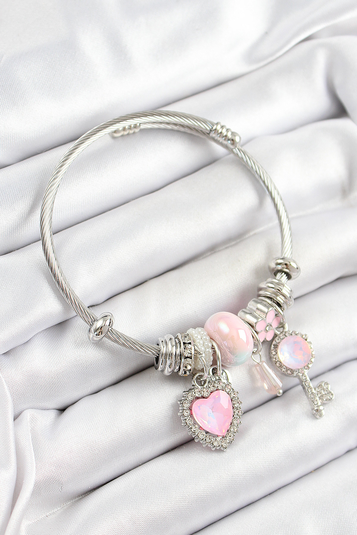 316L Çelik Pembe Zirkon Taşlı Yıldız Anahtar Ve Kalp Model Gümüş Renk Charm Bileklik - TJ-BB7276