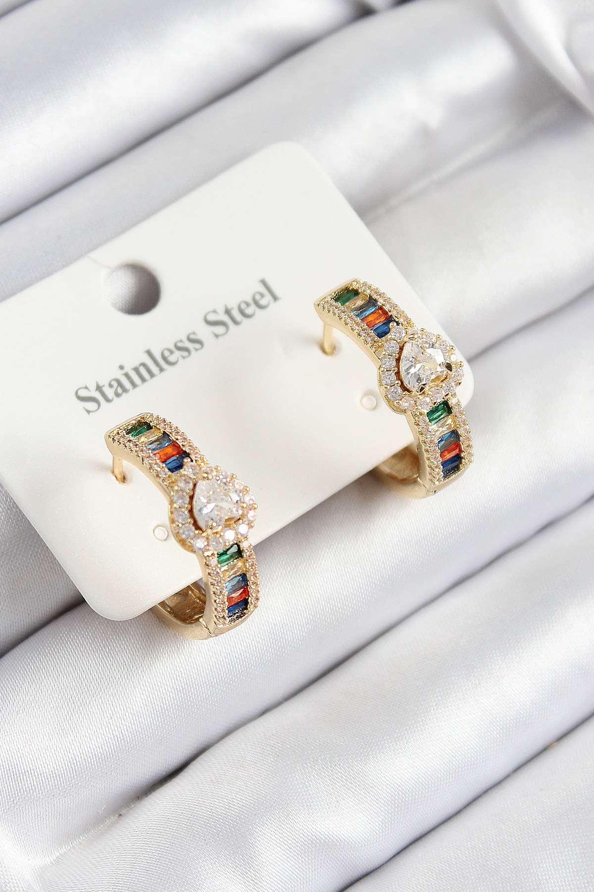 316L Çelik Renkli Zirkon Taşlı Kalpli Baget Halka Model Gold Renk Kadın Küpe - TJ-BKP10925