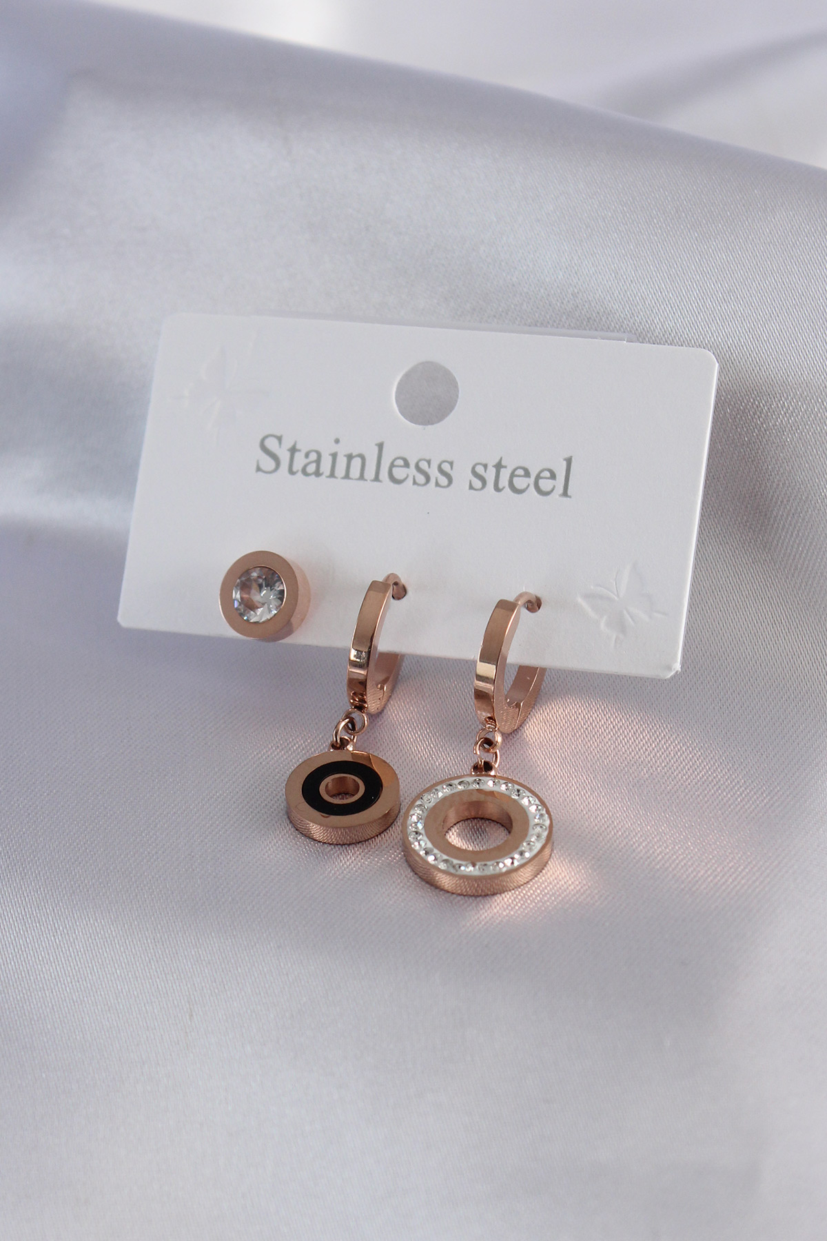 316L Çelik Rose Renk Daire Model Zirkon Taş Detay Kadın Küpe Kombini - TJ-BKP7073
