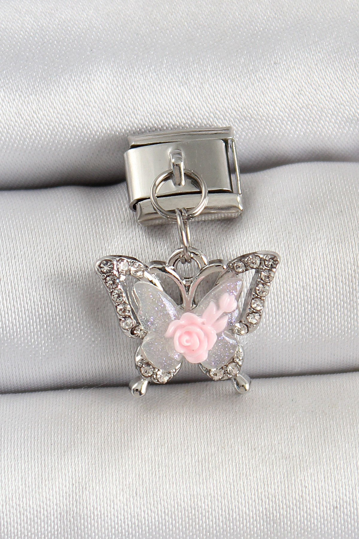 316L Çelik Sallantılı Gül Detaylı Zirkon Taşlı Kelebek Model Gümüş Renk Nomination Charm - TJ-BC1474