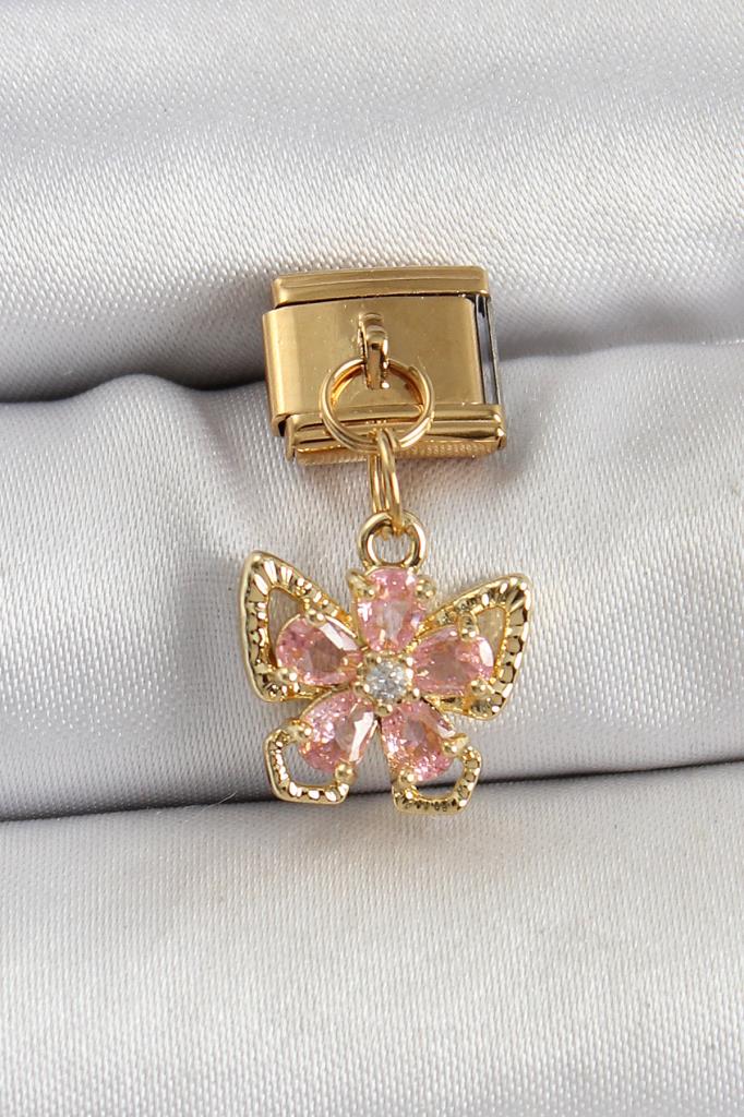 316L Çelik Sallantılı Zirkon Taşlı Çiçek Figürlü Kelebek Model Gold Renk Nomination Charm - BC1419