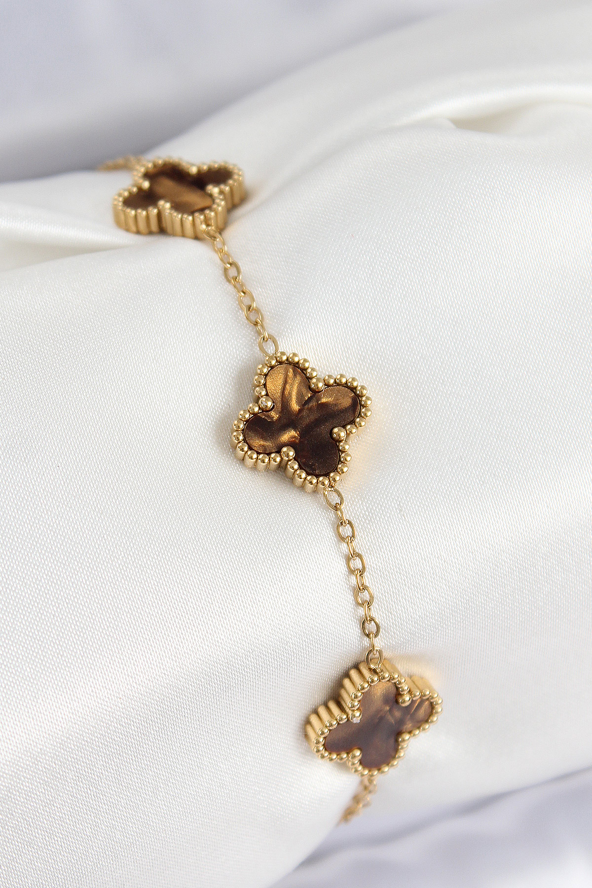 316L Çelik Sedefli Kahverengi Gold Renk Yonca Kadın Bileklik - TJ-BB7670