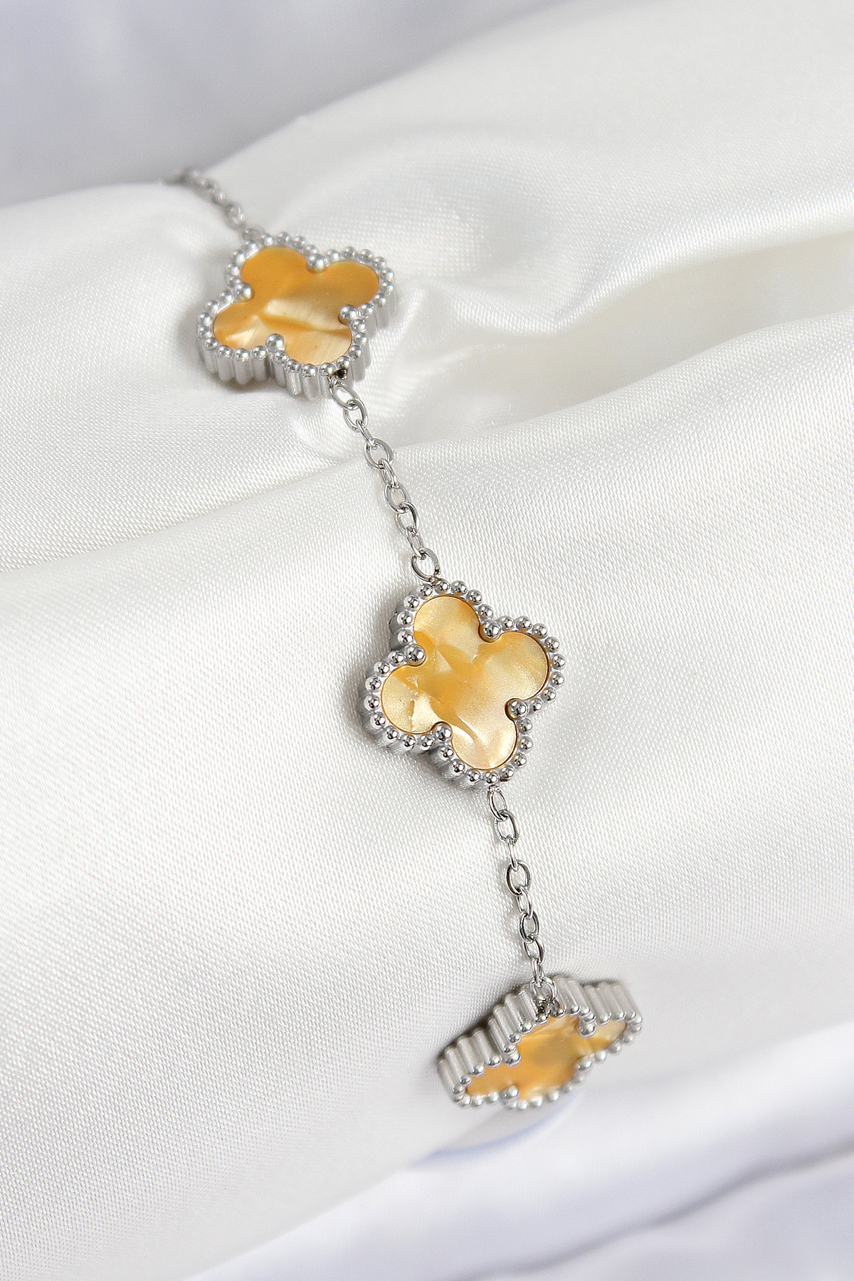 316L Çelik Sedefli Kehribar Sarı Gümüş Renk Yonca Kadın Bileklik - TJ-BB7676