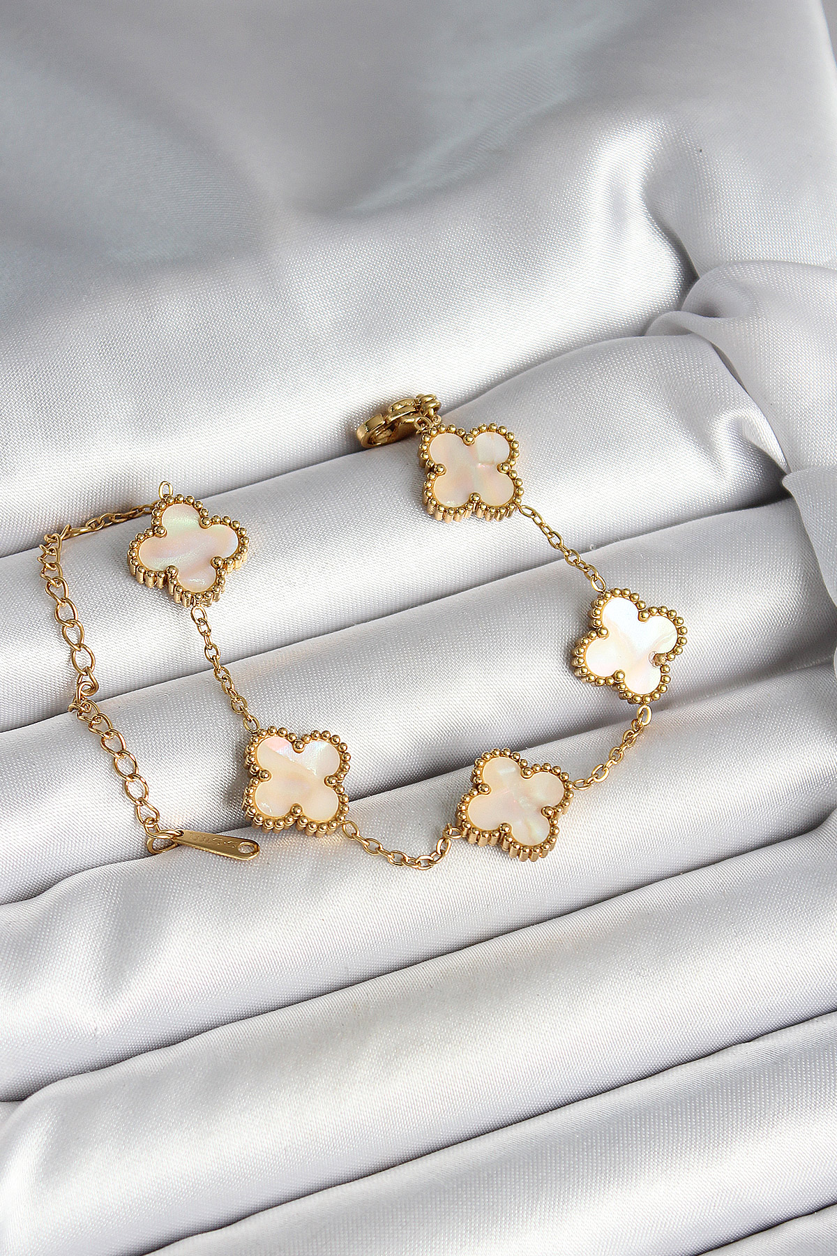 316L Çelik Sedefli Kırık Beyaz Gold Renk Yonca Kadın Bileklik - TJ-BB6965