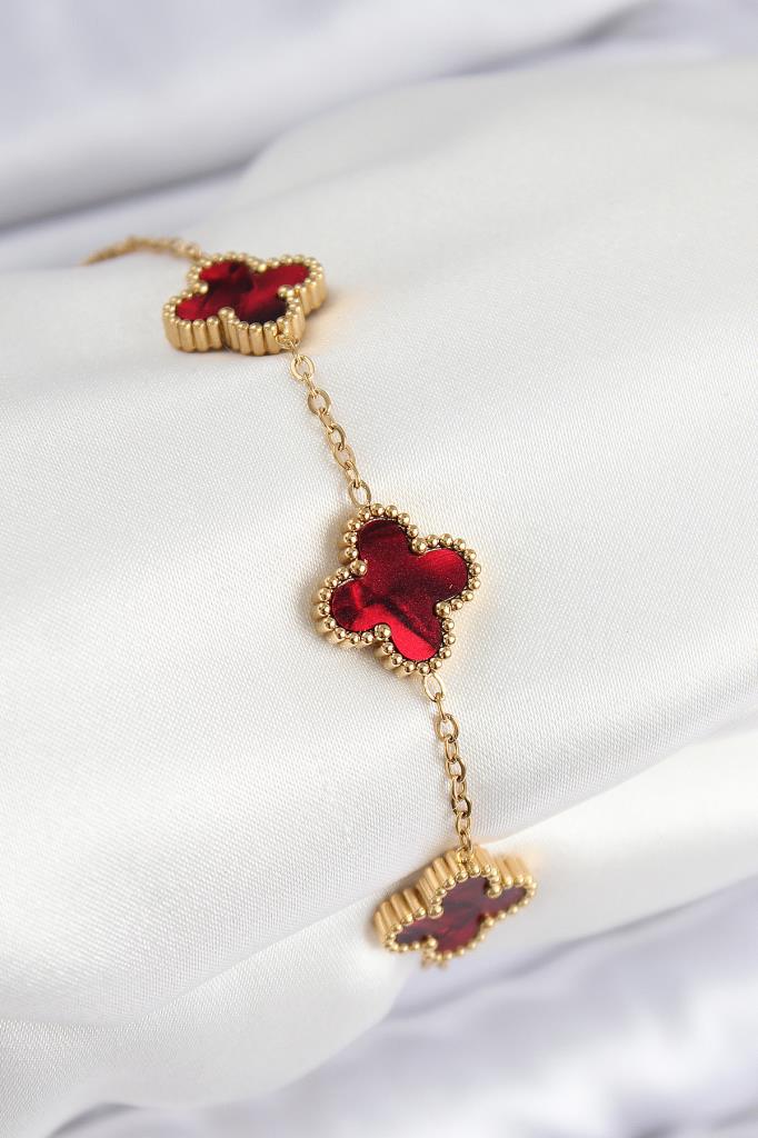 316L Çelik Sedefli Kırmızı Gold Renk Yonca Kadın Bileklik - BB7666