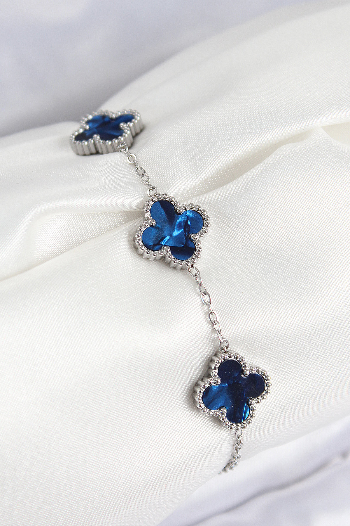 316L Çelik Sedefli Lacivert Gümüş Renk Yonca Kadın Bileklik - TJ-BB7671