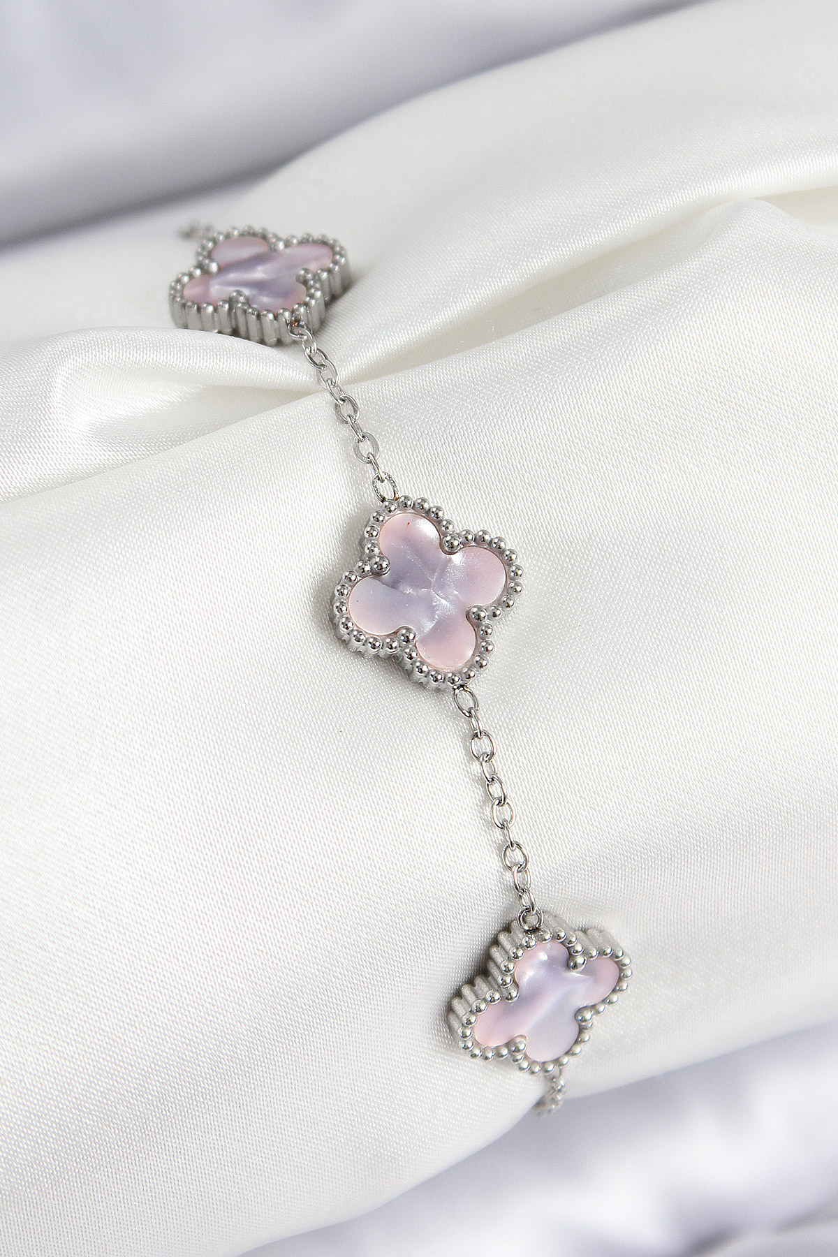 316L Çelik Sedefli Lila Gümüş Renk Yonca Kadın Bileklik - TJ-BB7673