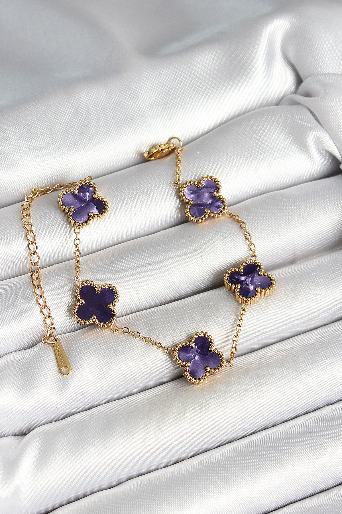 316L Çelik Sedefli Mor Gold Renk Yonca Kadın Bileklik - TJ-BB6966