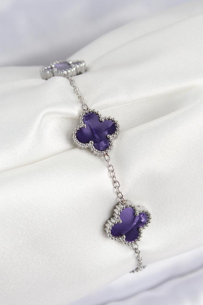 316L Çelik Sedefli Mor Gümüş Renk Yonca Kadın Bileklik - BB7674