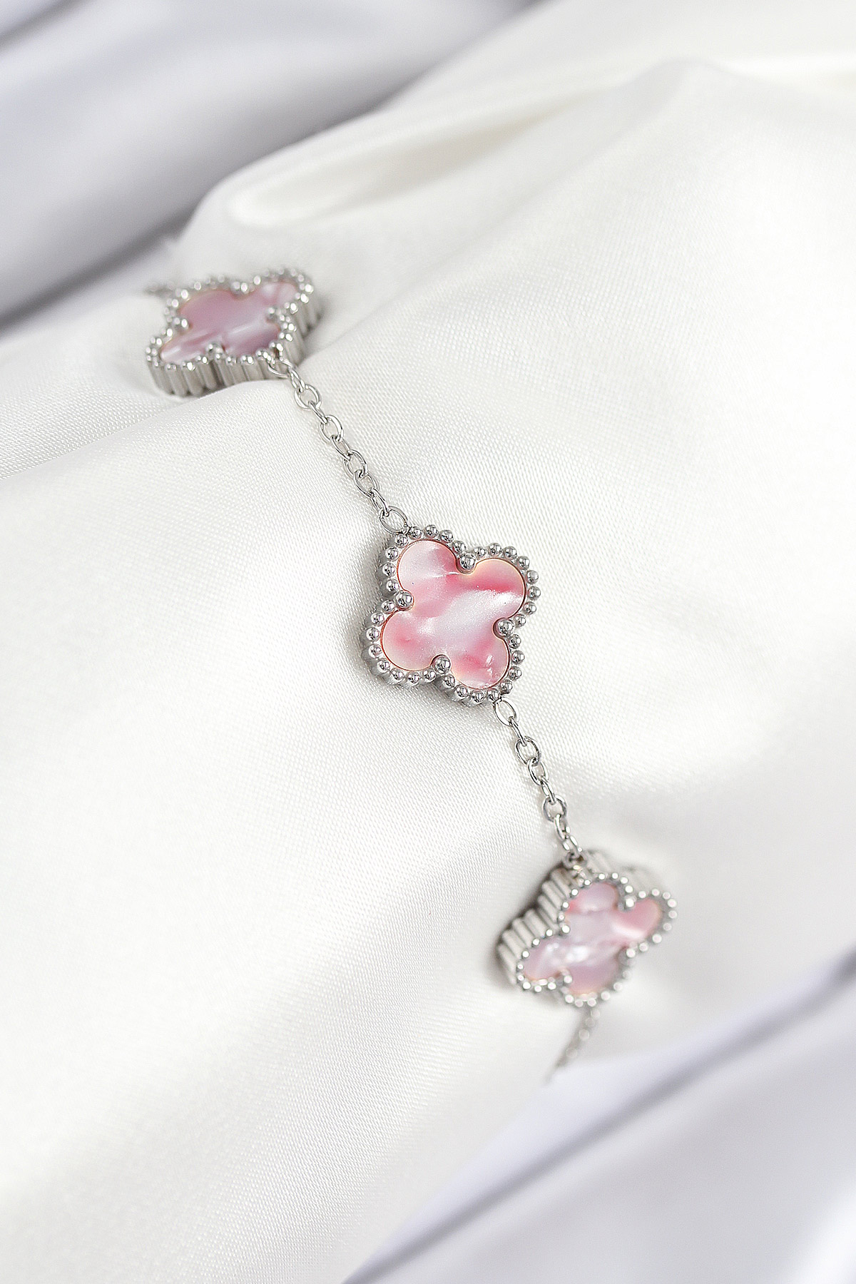 316L Çelik Sedefli Pembe Gümüş Renk Yonca Kadın Bileklik - TJ-BB7812