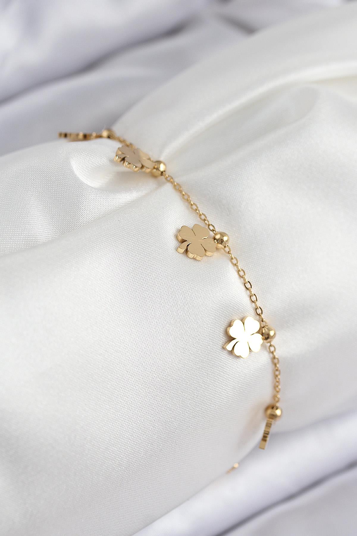 316L Çelik Sıralı Yonca Model Gold Renk Kadın Bileklik - TJ-BB7824