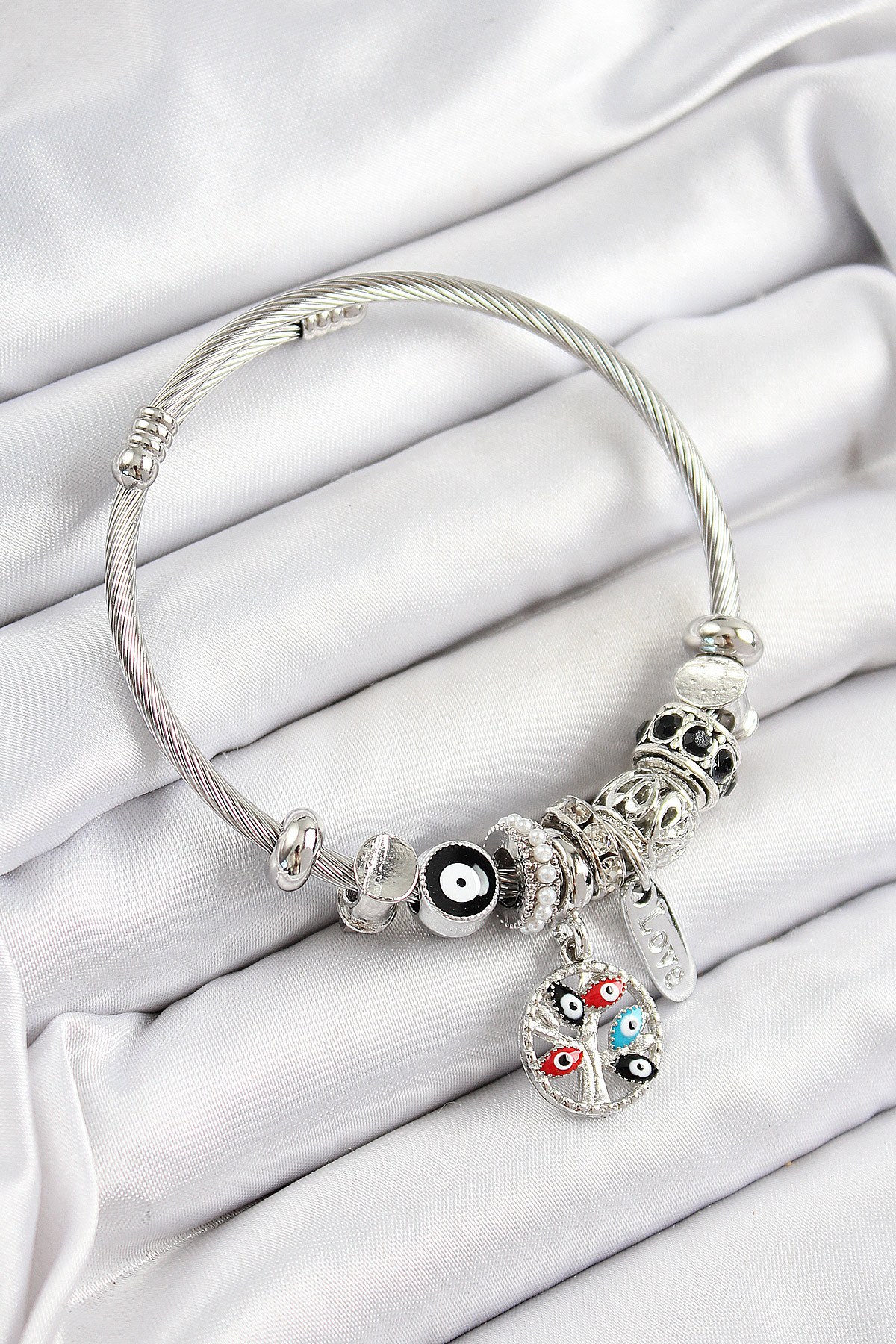 316L Çelik Siyah Nazarlı Zirkon Taşlı İnci Detaylı Hayat Ağacı Model Gümüş Renk Charm Bileklik - TJ-BB7242