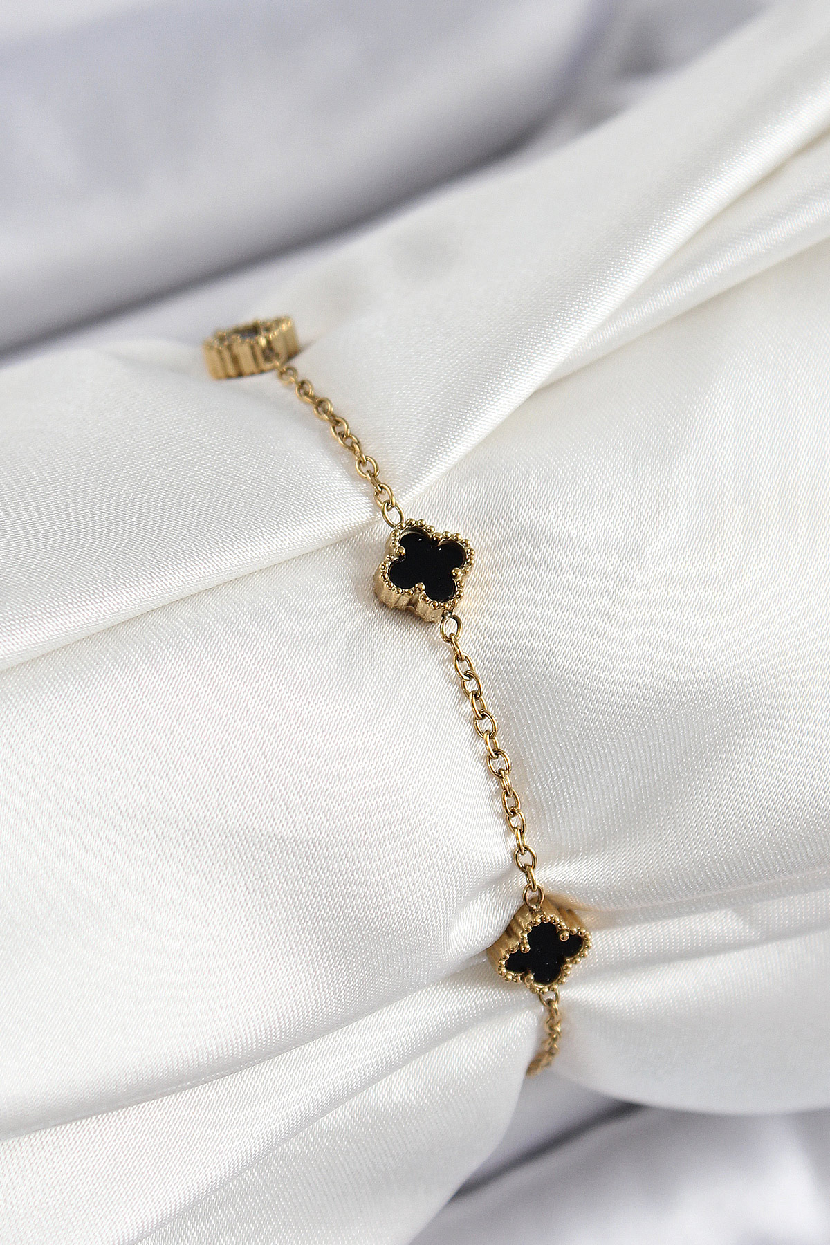 316L Çelik Siyah Sedef Yonca Model Gold Renk Kadın Bileklik - TJ-BB7359