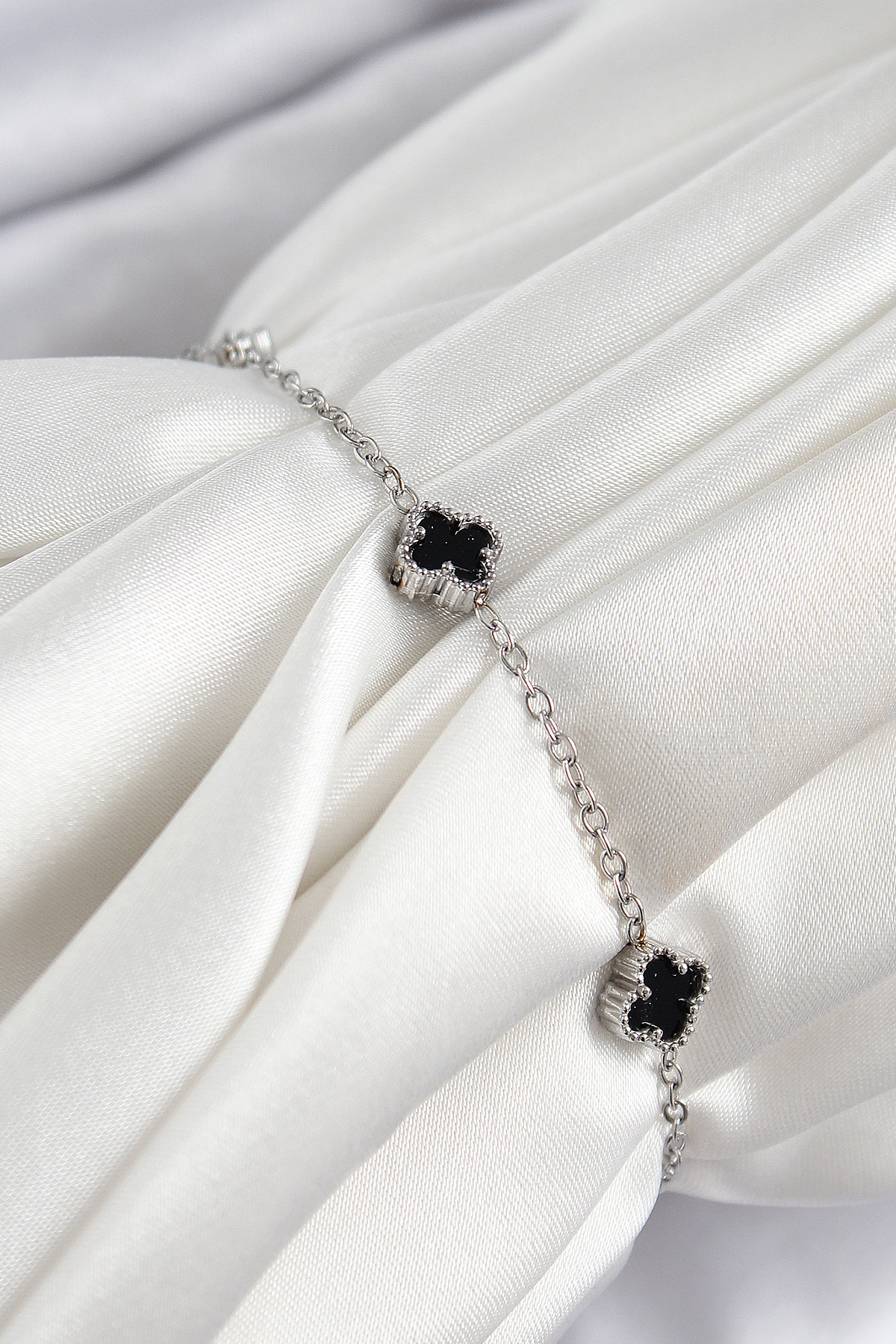 316L Çelik Siyah Sedef Yonca Model Gümüş Renk Kadın Bileklik - TJ-BB7360