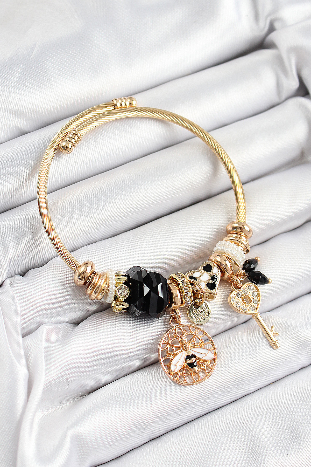 316L Çelik Siyah Zirkon Taşlı Baykuş Arı Ve Anahtar Model Gold Renk Charm Bileklik - TJ-BB7292