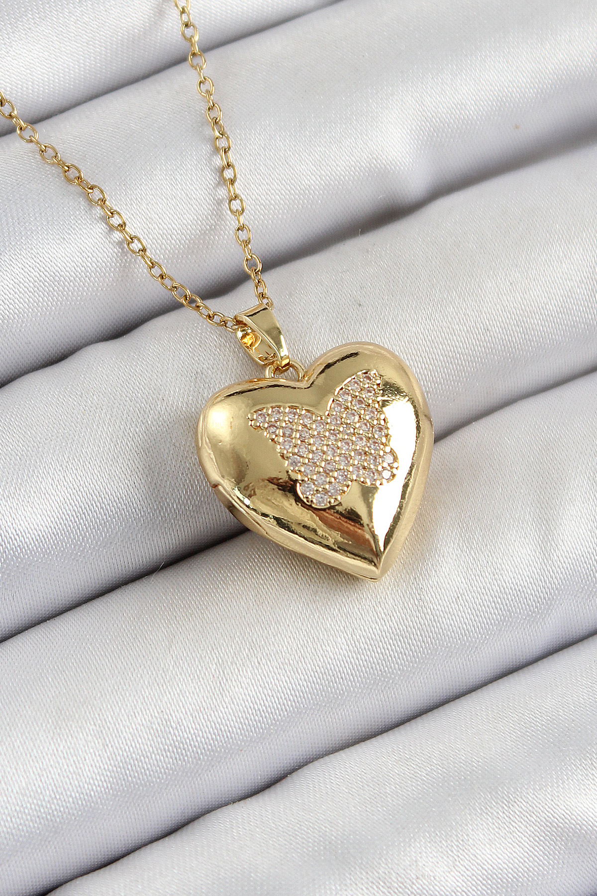 316L Çelik Zincir Açılabilir Kelebek Figürlü Kalp Model Zirkon Taşlı Gold Renk Kadın Kolye - TJ-BKO10266
