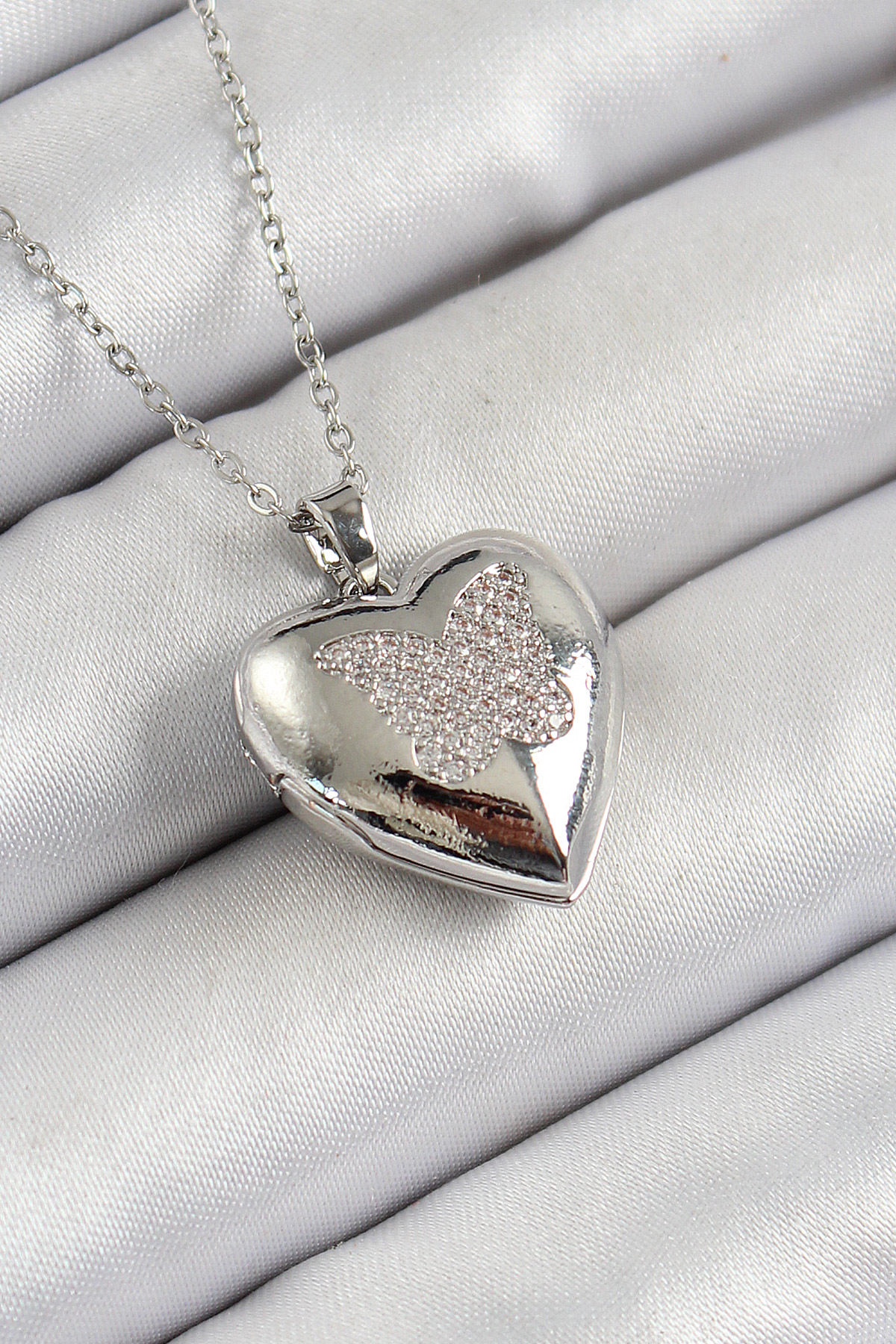 316L Çelik Zincir Açılabilir Kelebek Figürlü Kalp Model Zirkon Taşlı Gümüş Renk Kadın Kolye - TJ-BKO10265