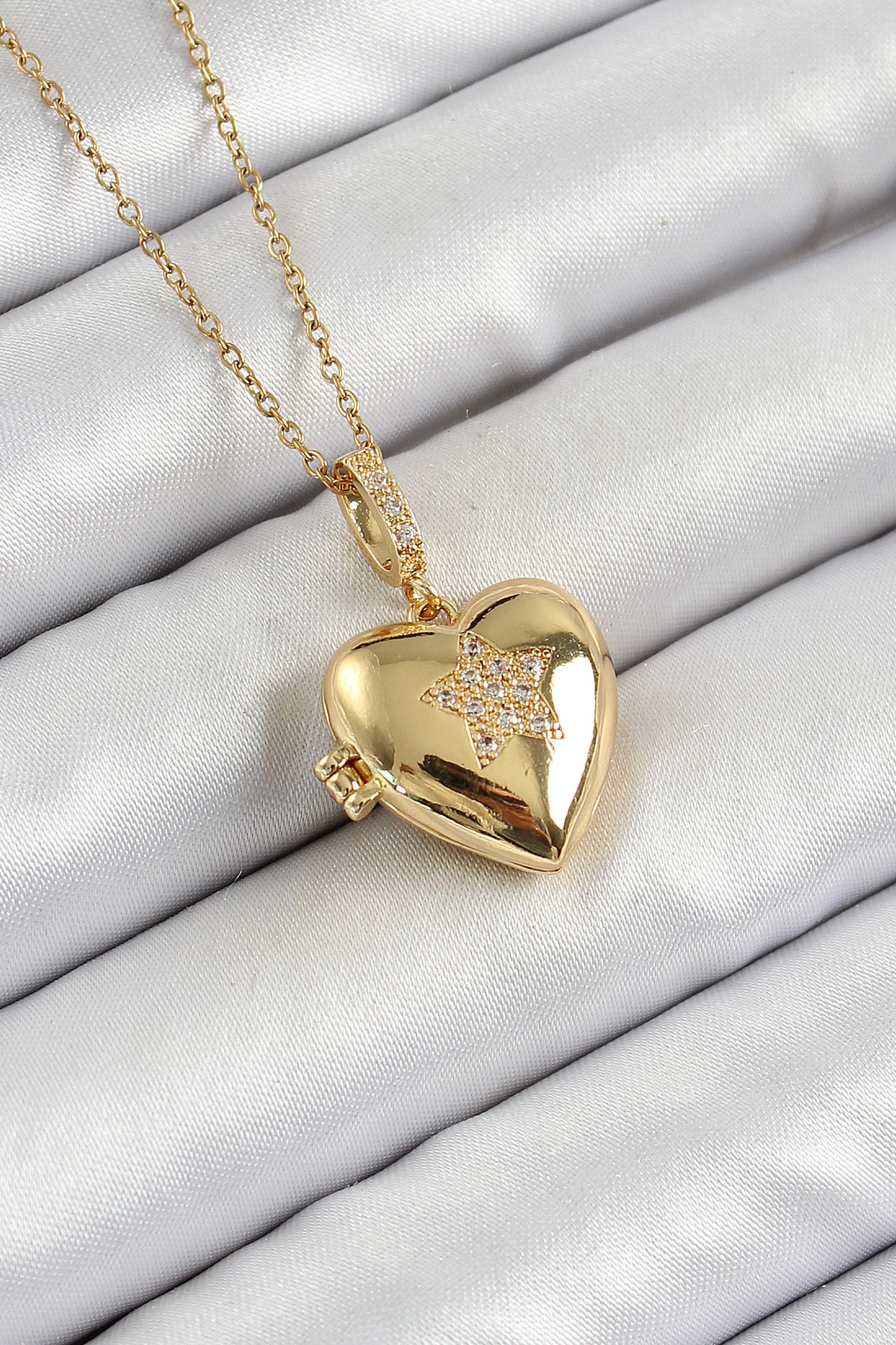 316L Çelik Zincir Açılabilir Yıldız Figürlü Kalp Model Zirkon Taşlı Gold Renk Kadın Kolye - TJ-BKO10261