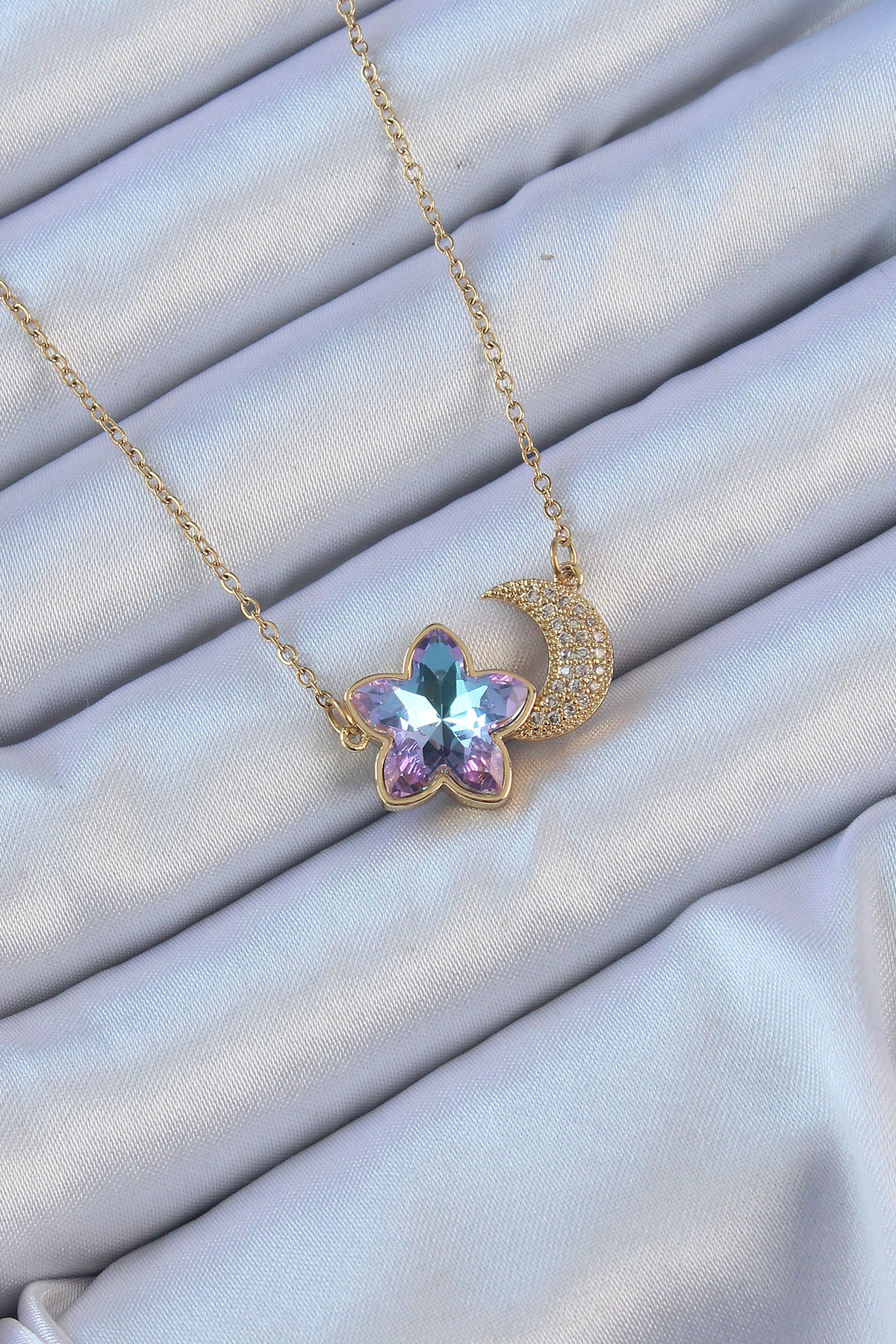 316L Çelik Zincir Altın Renk Ay Tasarımlı Renkli Zirkon Taşlı Çiçek Kolye - TJ-BKO9135
