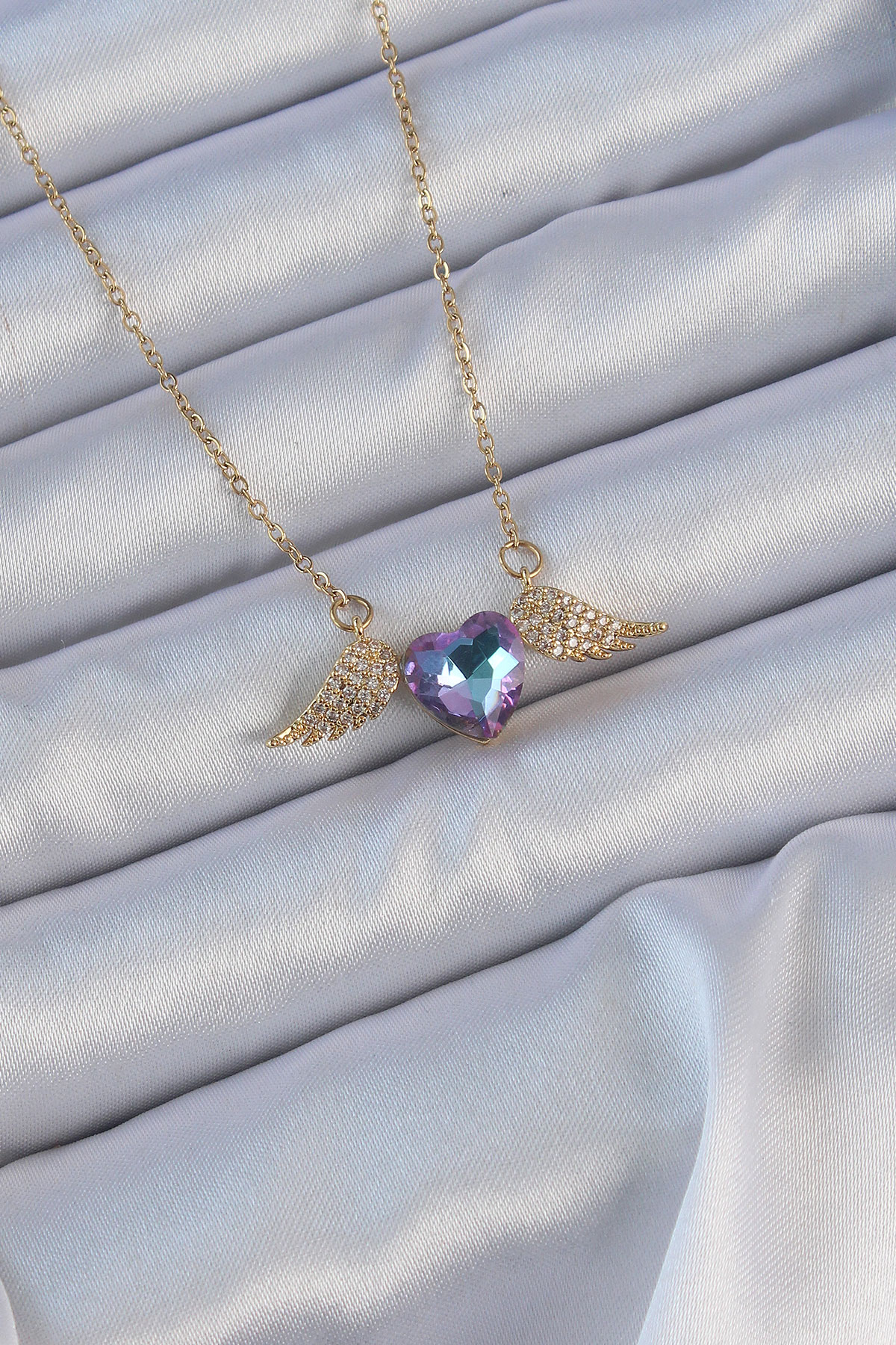 316L Çelik Zincir Altın Renk Mavi Mor Zirkon Taşlı Kanatlı Kalp Kolye - TJ-BKO9161