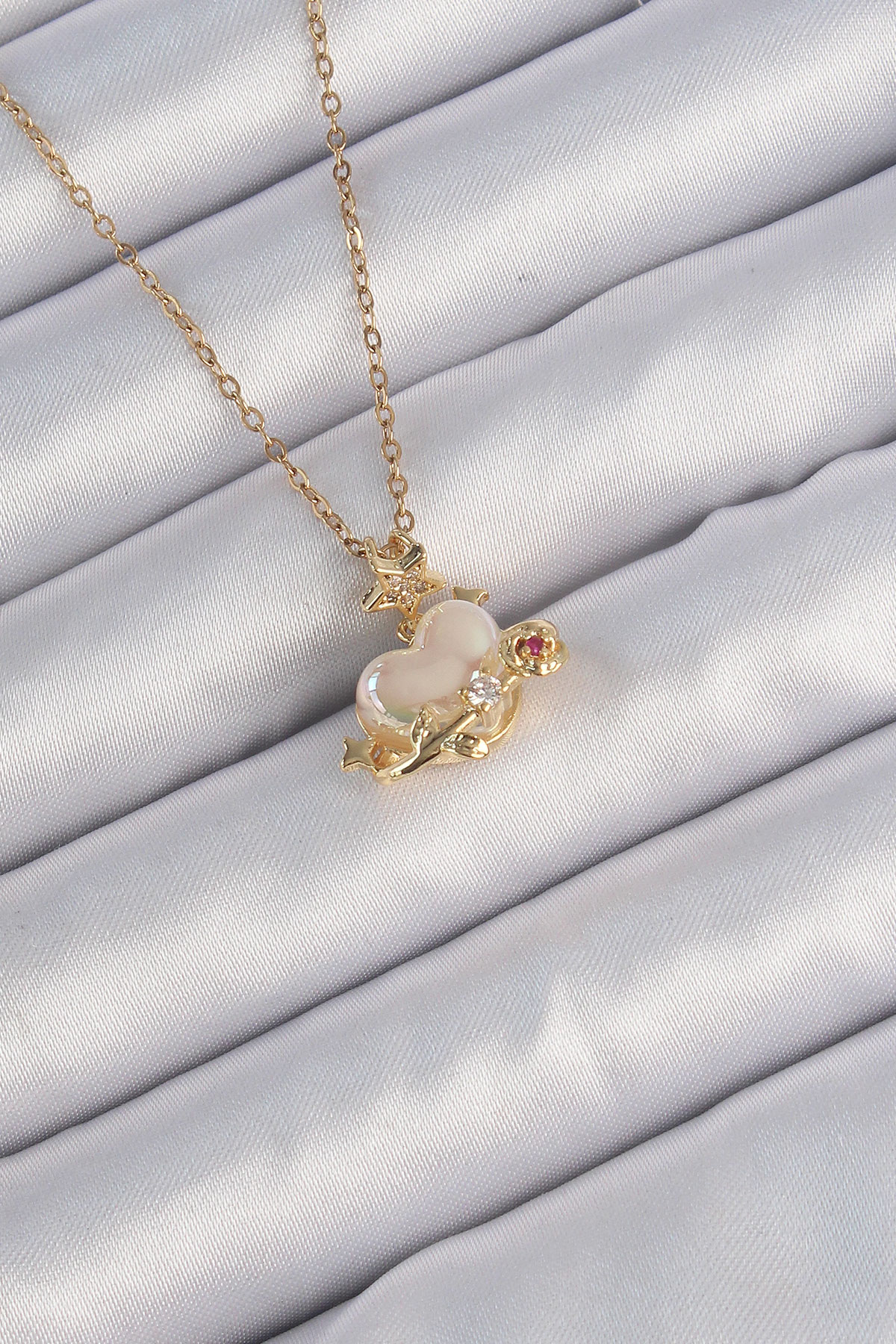 316L Çelik Zincir Altın Renk Sedefli Kalp Figür Zirkon Taşlı Gezegen Kolye - TJ-BKO9181