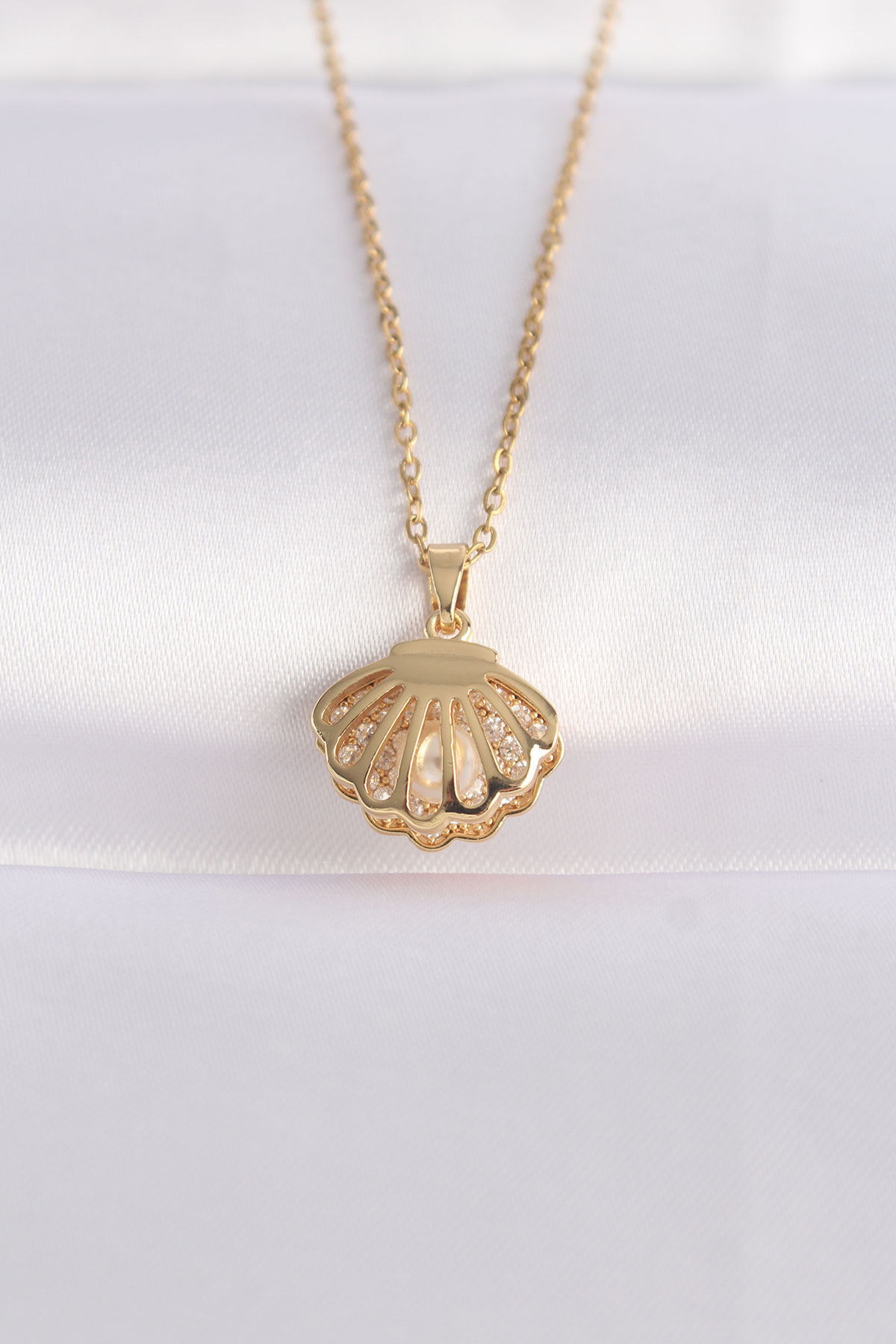 316L Çelik Zincir Altın Renk Zirkon Taşlı İnci Detay İstiridye Kolye - TJ-BKO8601