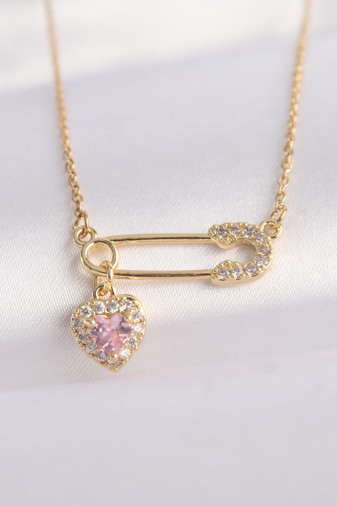 316L Çelik Zincir Altın Renk Zirkon Taşlı Kalp Detay Çengelli İğne Tasarımlı Kolye - TJ-BKO8620