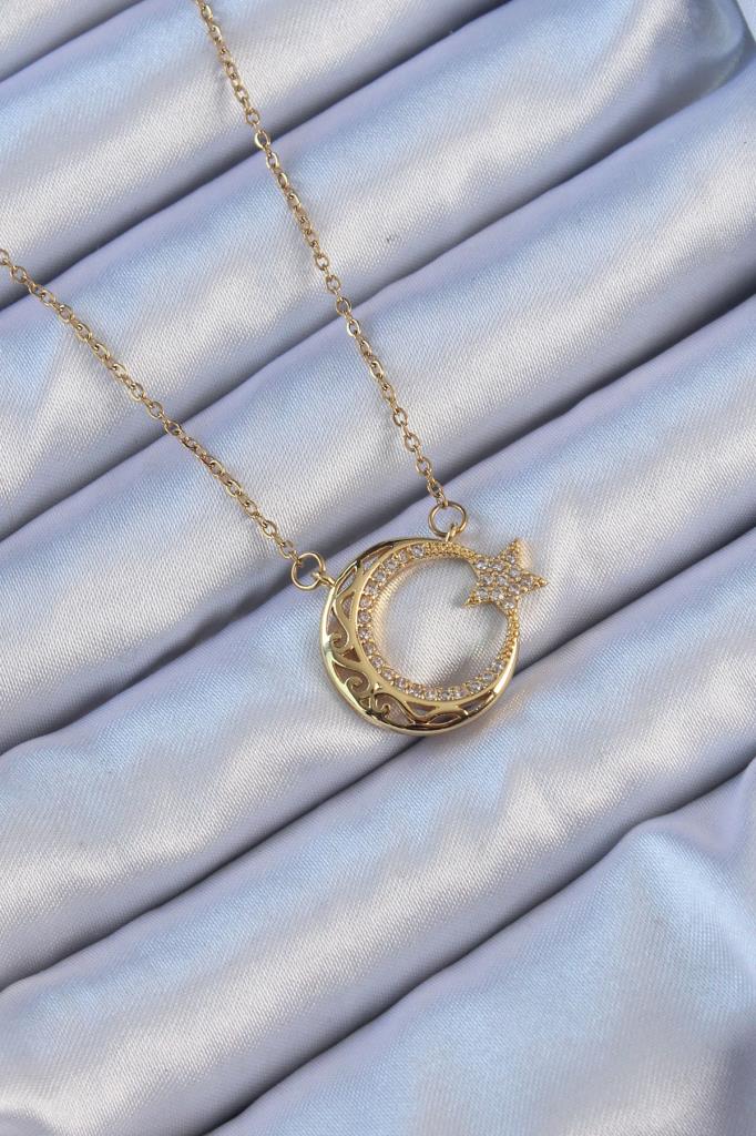 316L Çelik Zincir Altın Renk Zirkon Taşlı Motifli Ay Yıldız Kolye - TJ-BKO9115