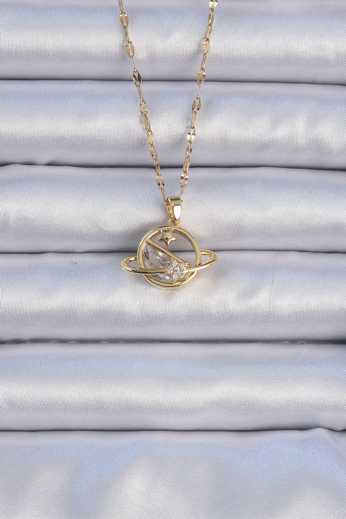 316L Çelik Zincir Altın Renk Zirkon Taşlı Yıldızlı Satürn Kolye - TJ-BKO9071