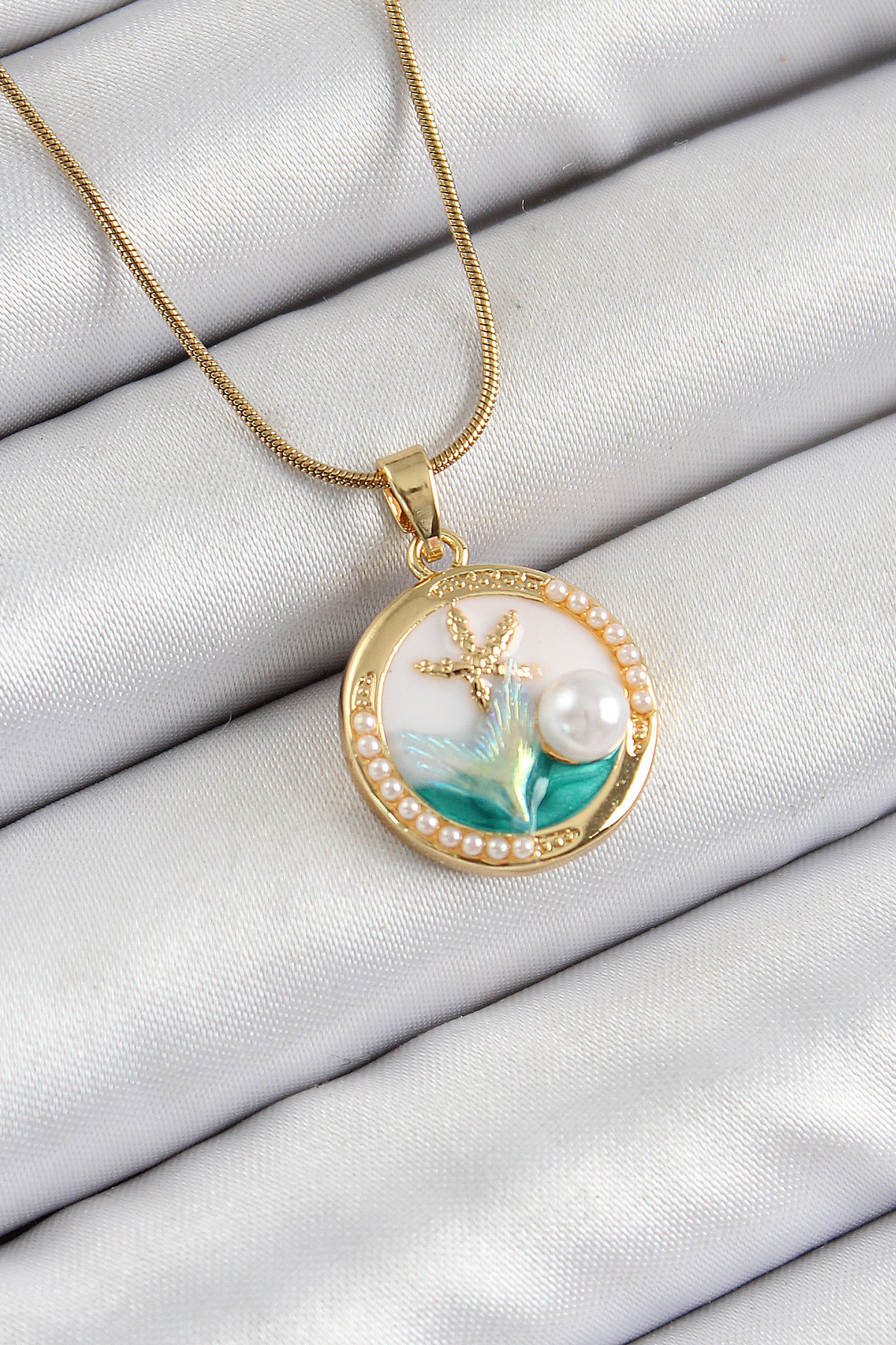 316L Çelik Zincir Beyaz Mineli Sanatsal Portre İnci Detaylı Deniz Yılıdızı Model Gold Renk Kadın Kolye - TJ-BKO10286