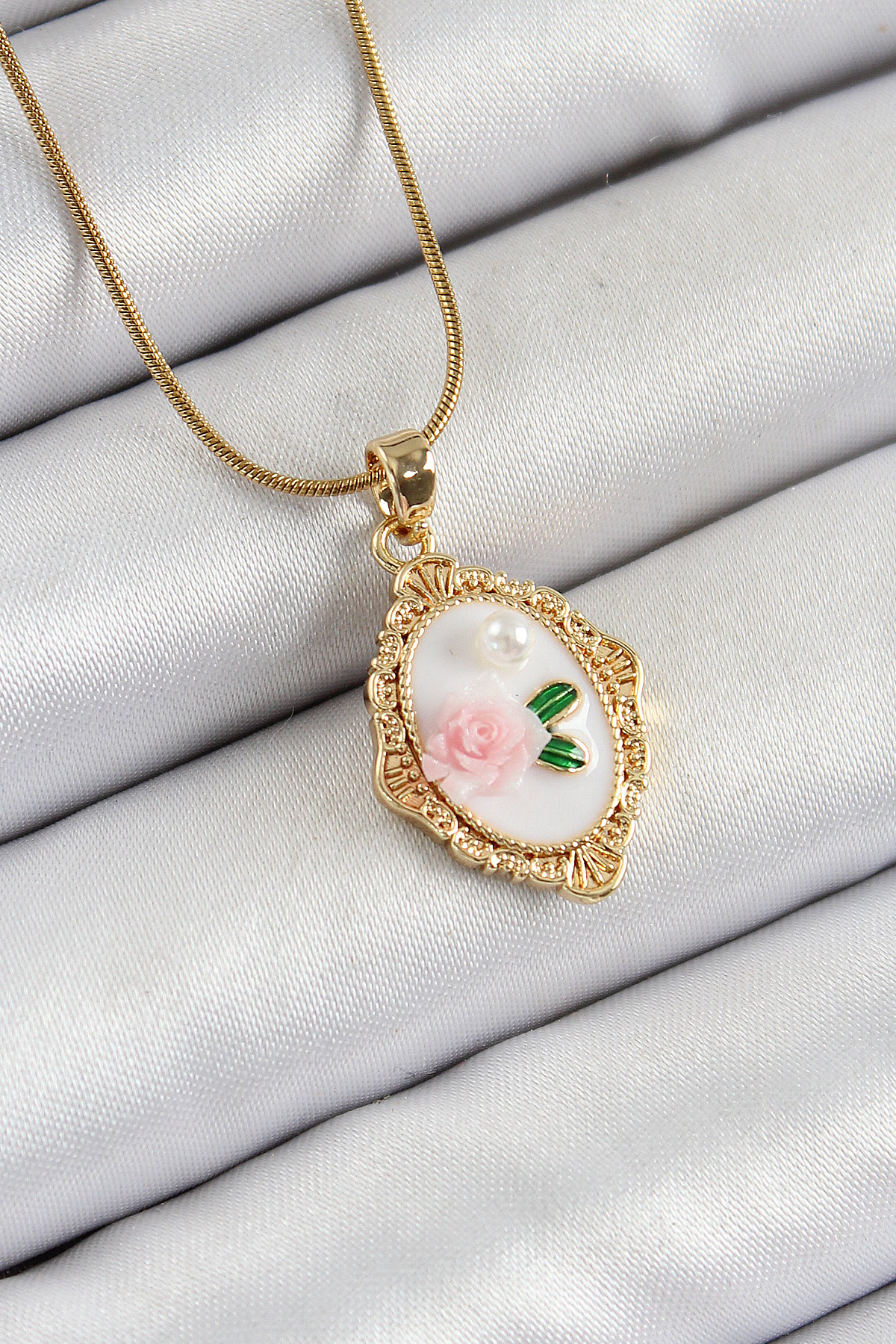 316L Çelik Zincir Beyaz Sanatsal Portre İnci Detaylı Gül Figürlü Model Gold Renk Kadın Kolye - TJ-BKO10282