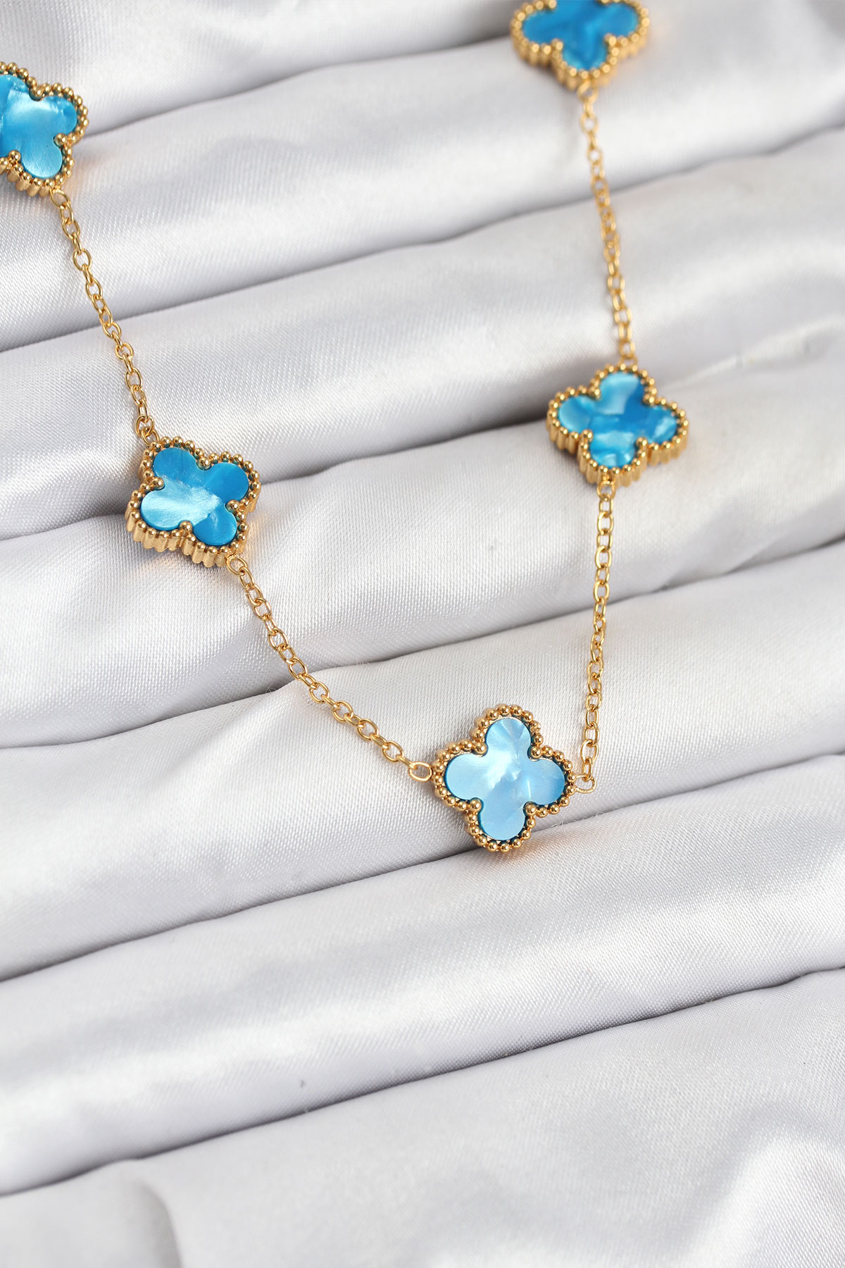 316L Çelik Zincir Gold Buz Mavisi Renk Yonca Kolye - TJ-BKO10566