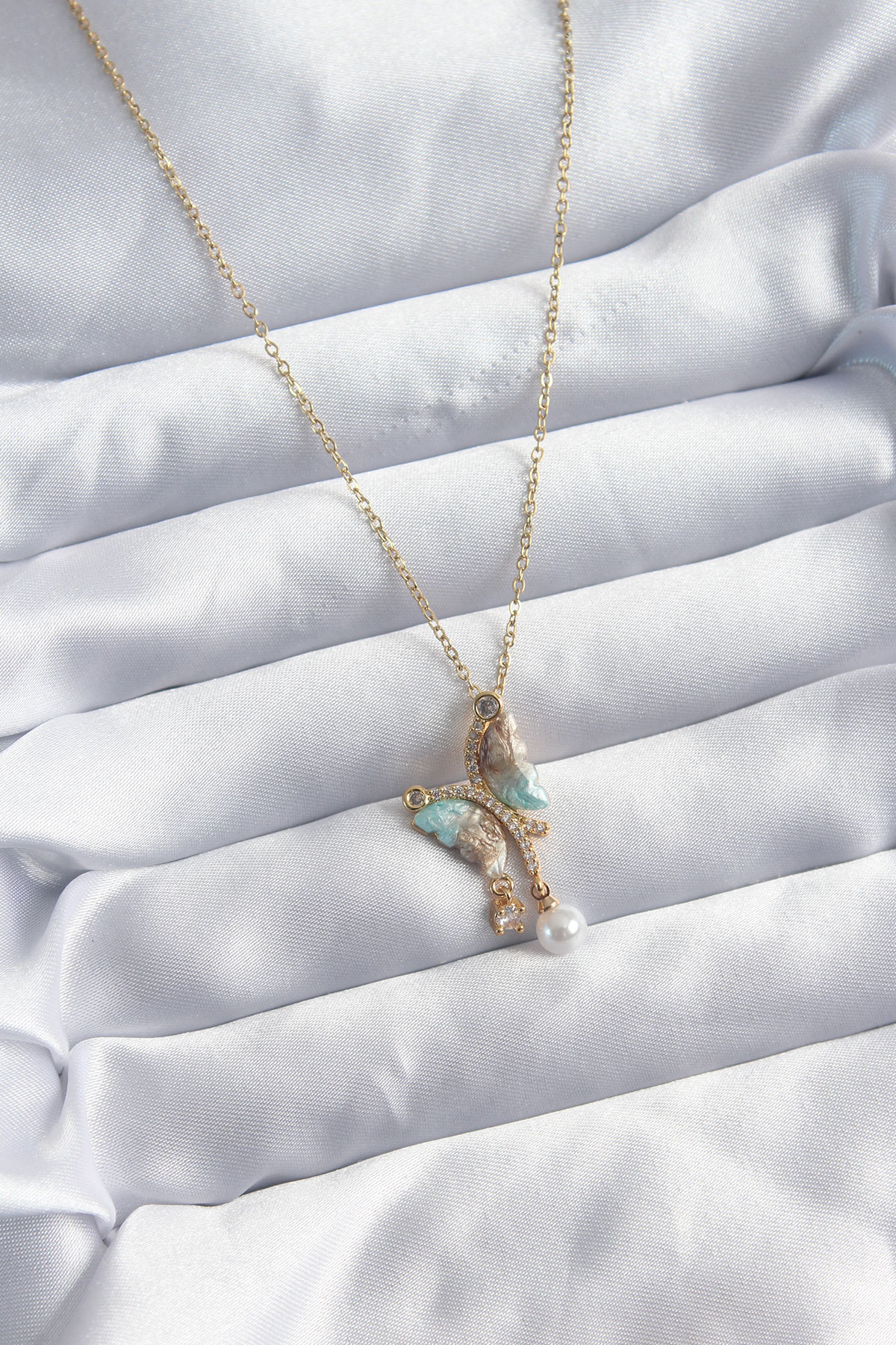 316L Çelik Zincir Gold Karışık Renk Zirkon Taşlı Kelebek Figür İnci Kadın Kolye - TJ-BKO8048