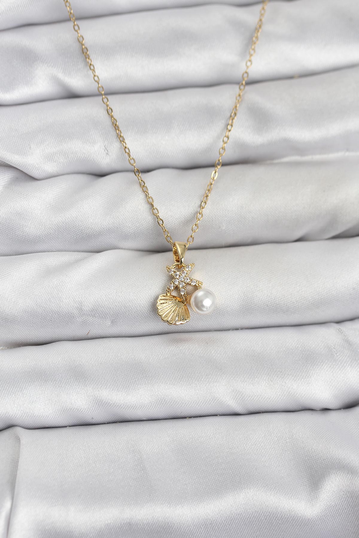 316L Çelik Zincir Gold Renk Deniz Kabuğu ve Deniz Yıldızı Model Zirkon Taşlı Kadın Kolye - TJ-BKO10841