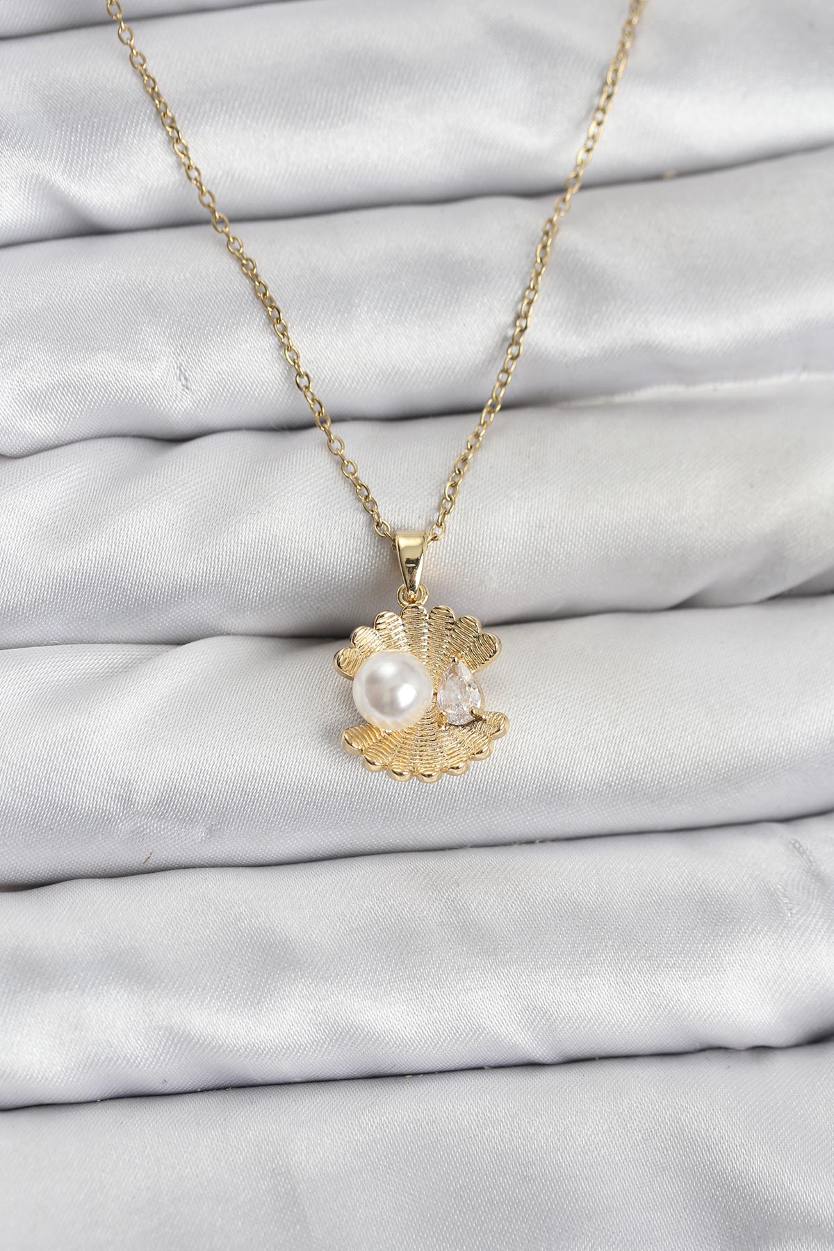 316L Çelik Zincir Gold Renk İstiridye İnci Model Zirkon Taşlı Kadın Kolye - TJ-BKO10850