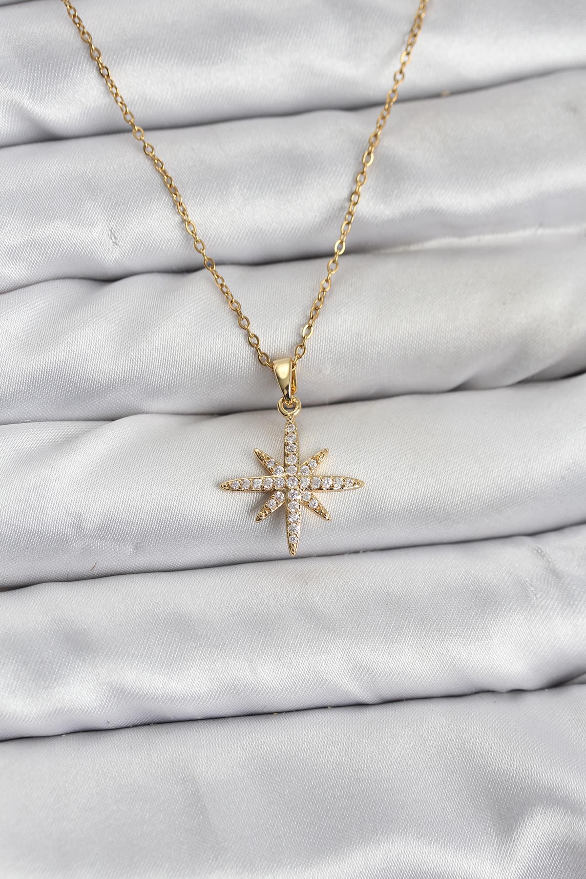 316L Çelik Zincir Gold Renk Kutup Yıldızı Model Zirkon Taşlı Kadın Kolye - TJ-BKO10839