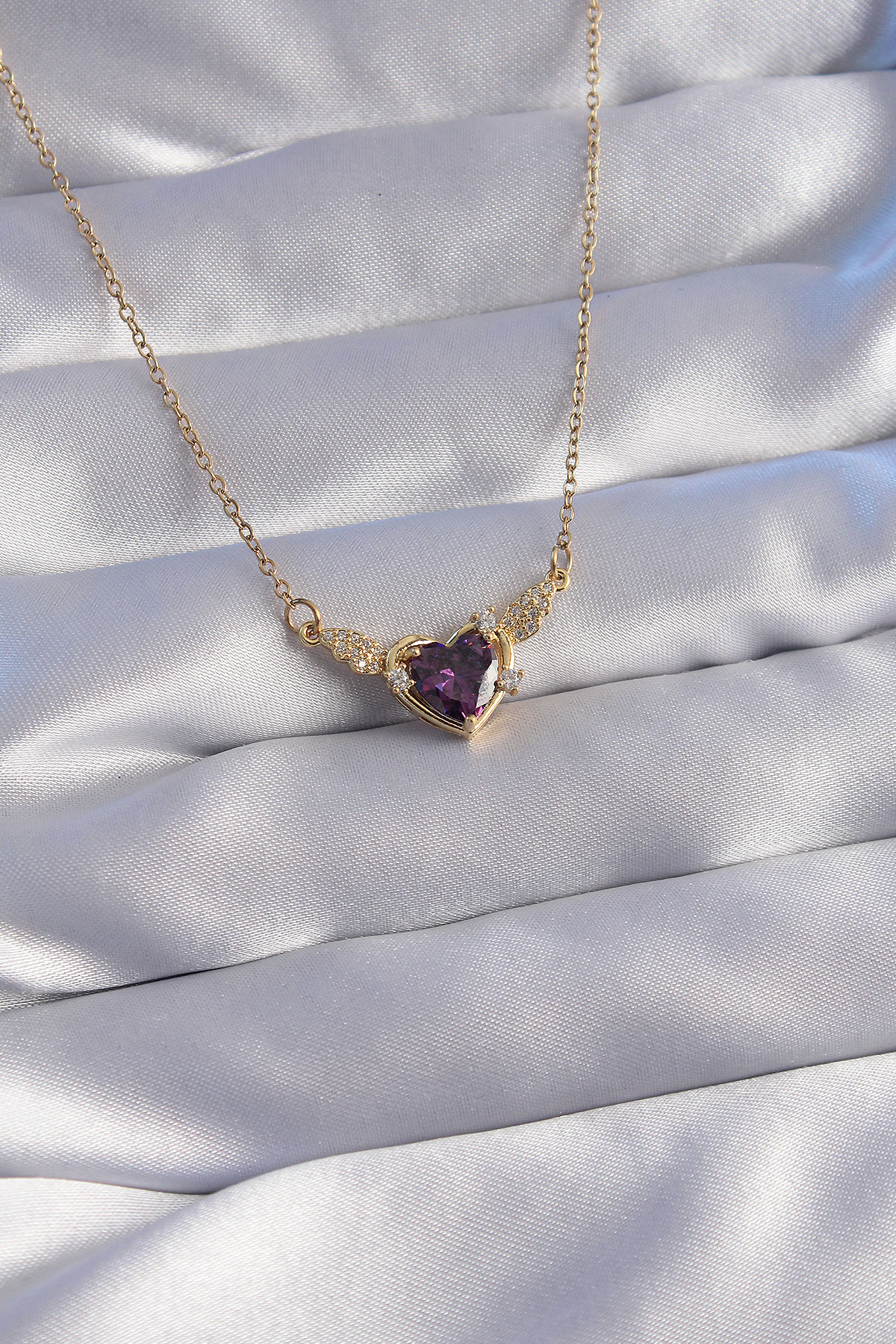 316L Çelik Zincir Gold Renk Mor Zirkon Taşlı Kanatlı Kalp Kolye - TJ-BKO8783