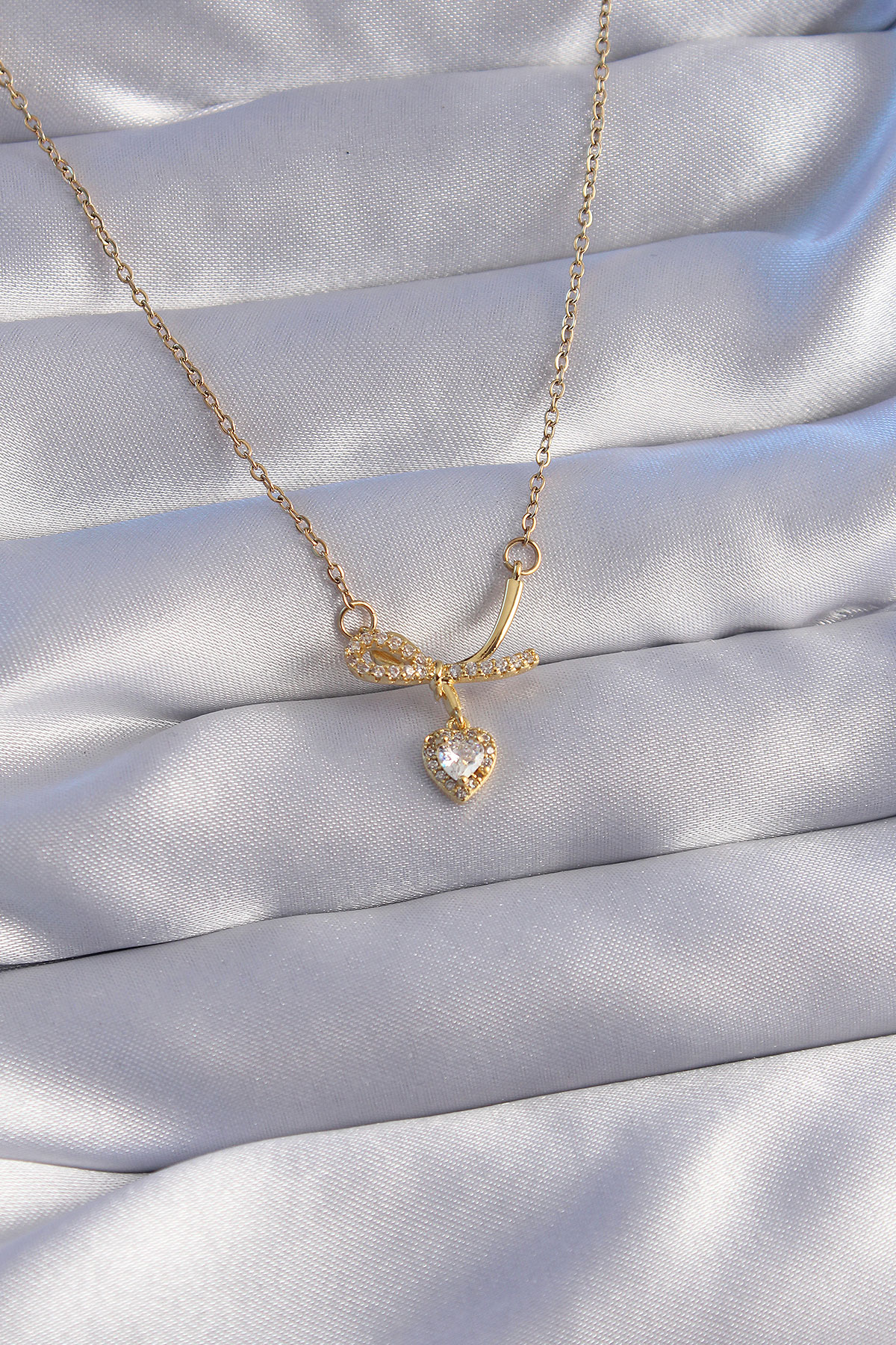 316L Çelik Zincir Gold Renk Zirkon Taşlı Yarım Fiyonk Kalp Kolye - TJ-BKO8789