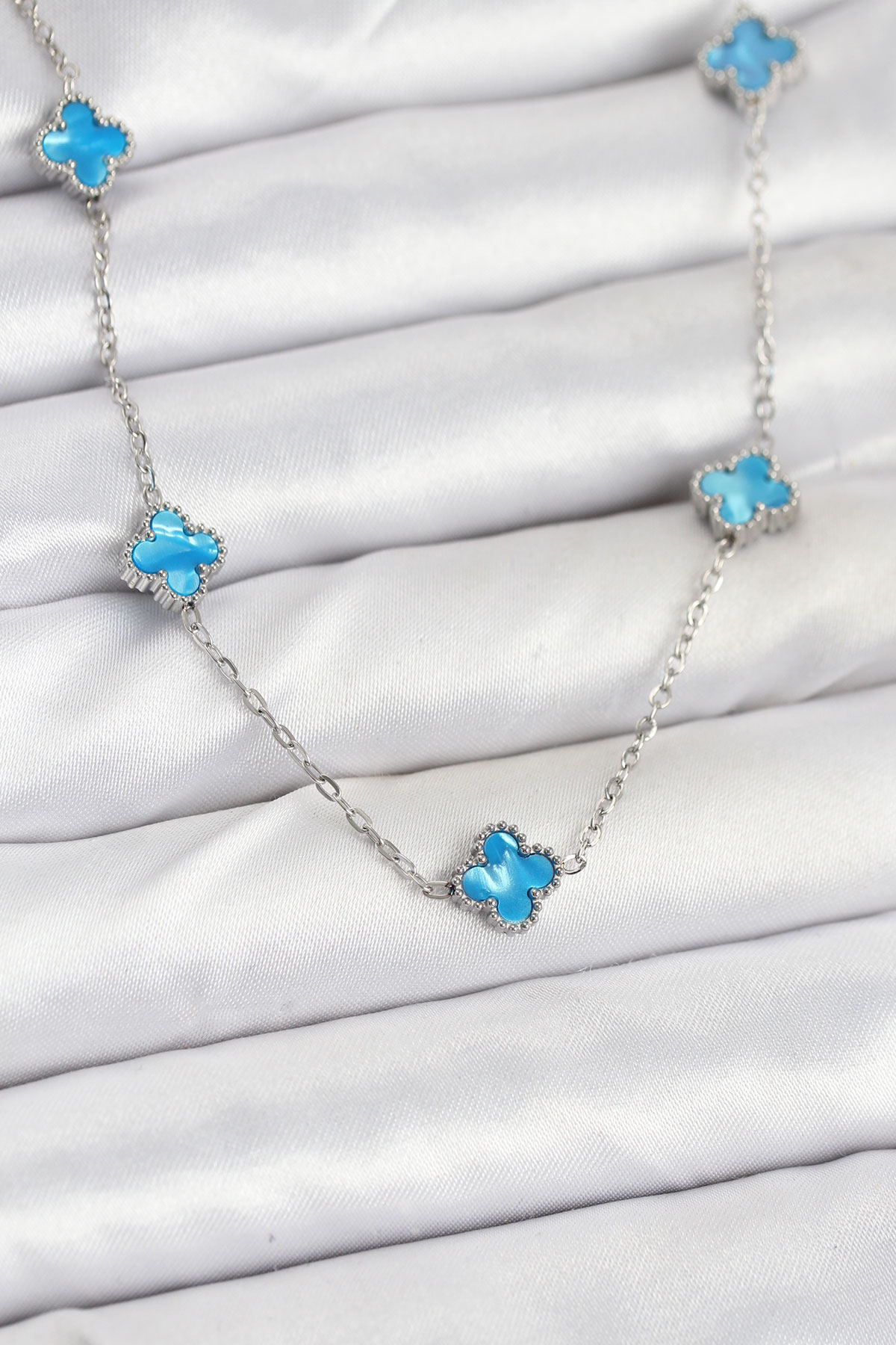316L Çelik Zincir Gümüş Renk Buz Mavisi Baby Boy Yonca Kadın Kolye - TJ-BKO10576