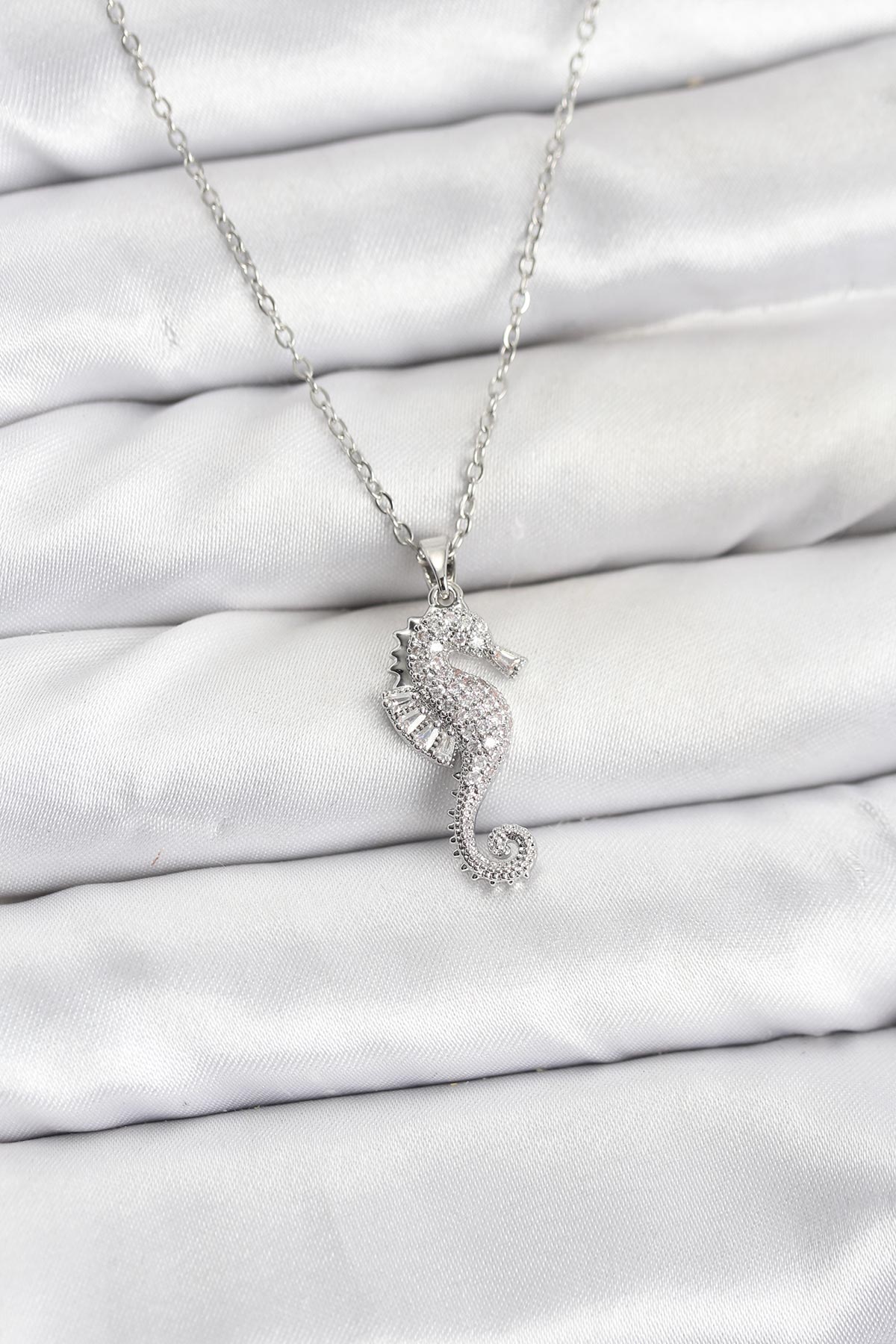 316L Çelik Zincir Gümüş Renk Deniz Atı Model Zirkon Taşlı Kadın Kolye - TJ-BKO10894
