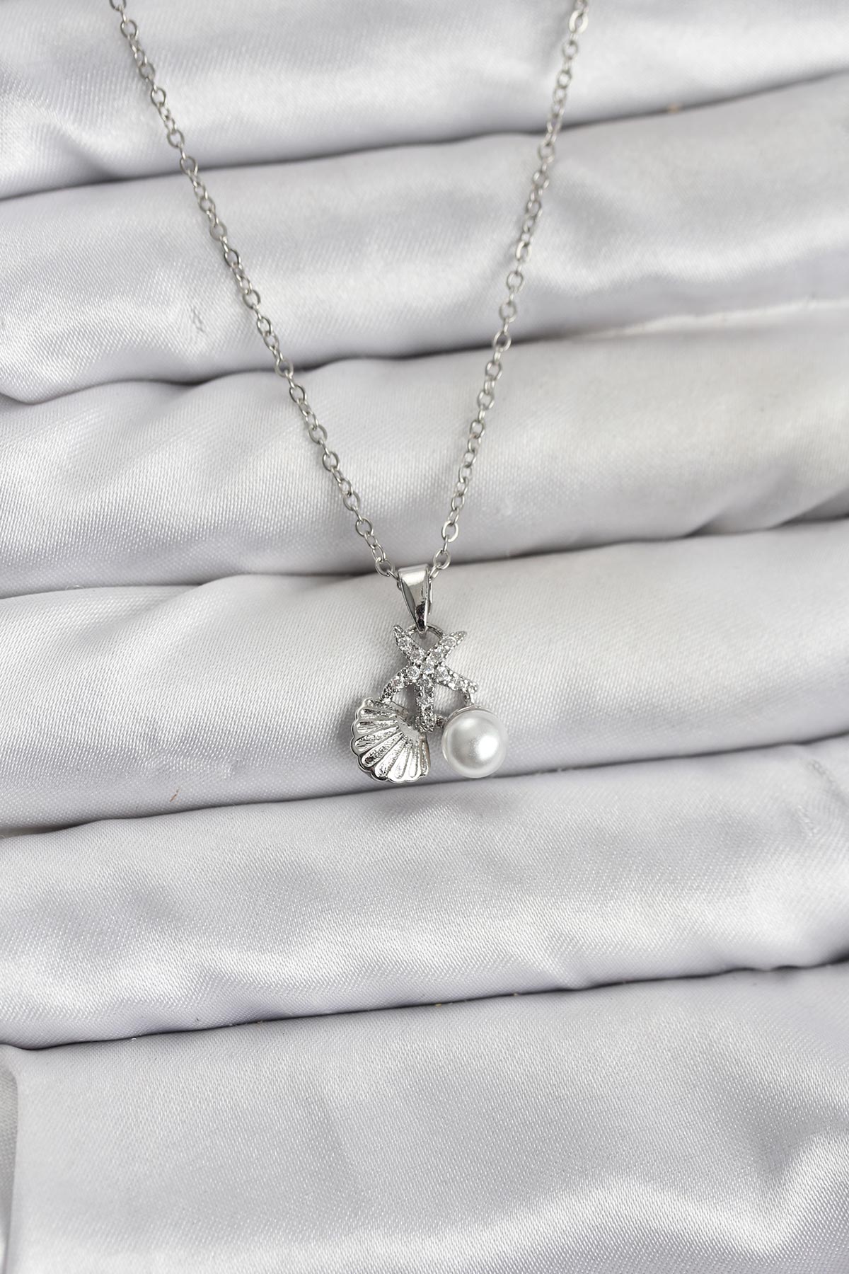 316L Çelik Zincir Gümüş Renk Deniz Kabuğu ve Deniz Yıldızı Model Zirkon Taşlı Kadın Kolye - TJ-BKO10840