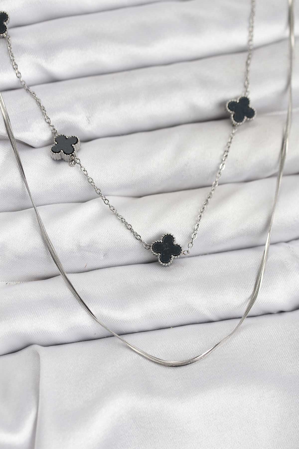316L Çelik Zincir Gümüş Renk İtalyan Zincirli Siyah Yonca Model Kadın Kolye - TJ-BKO10781