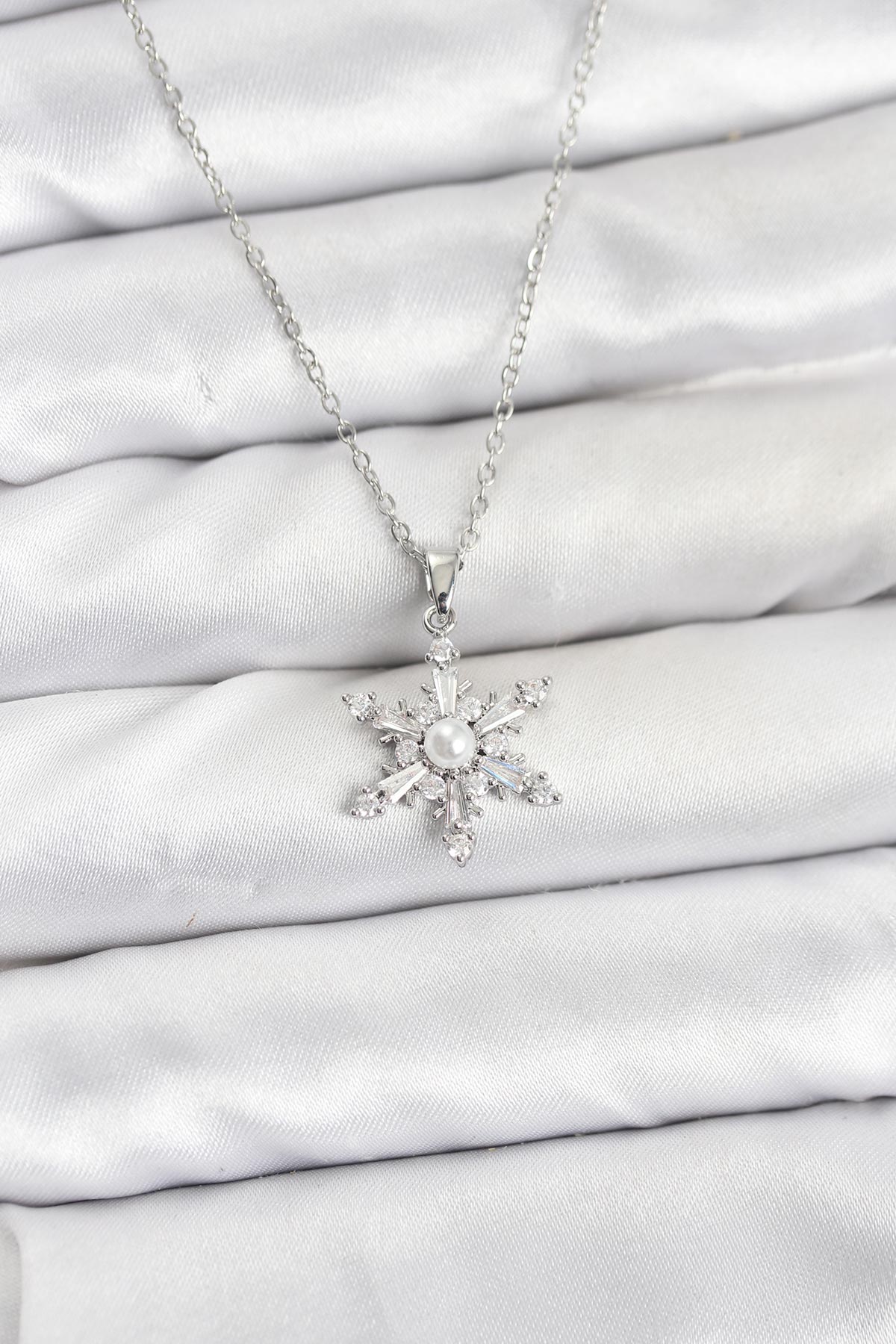 316L Çelik Zincir Gümüş Renk Kar Tanesi Model Zirkon Taşlı Kadın Kolye - TJ-BKO10864