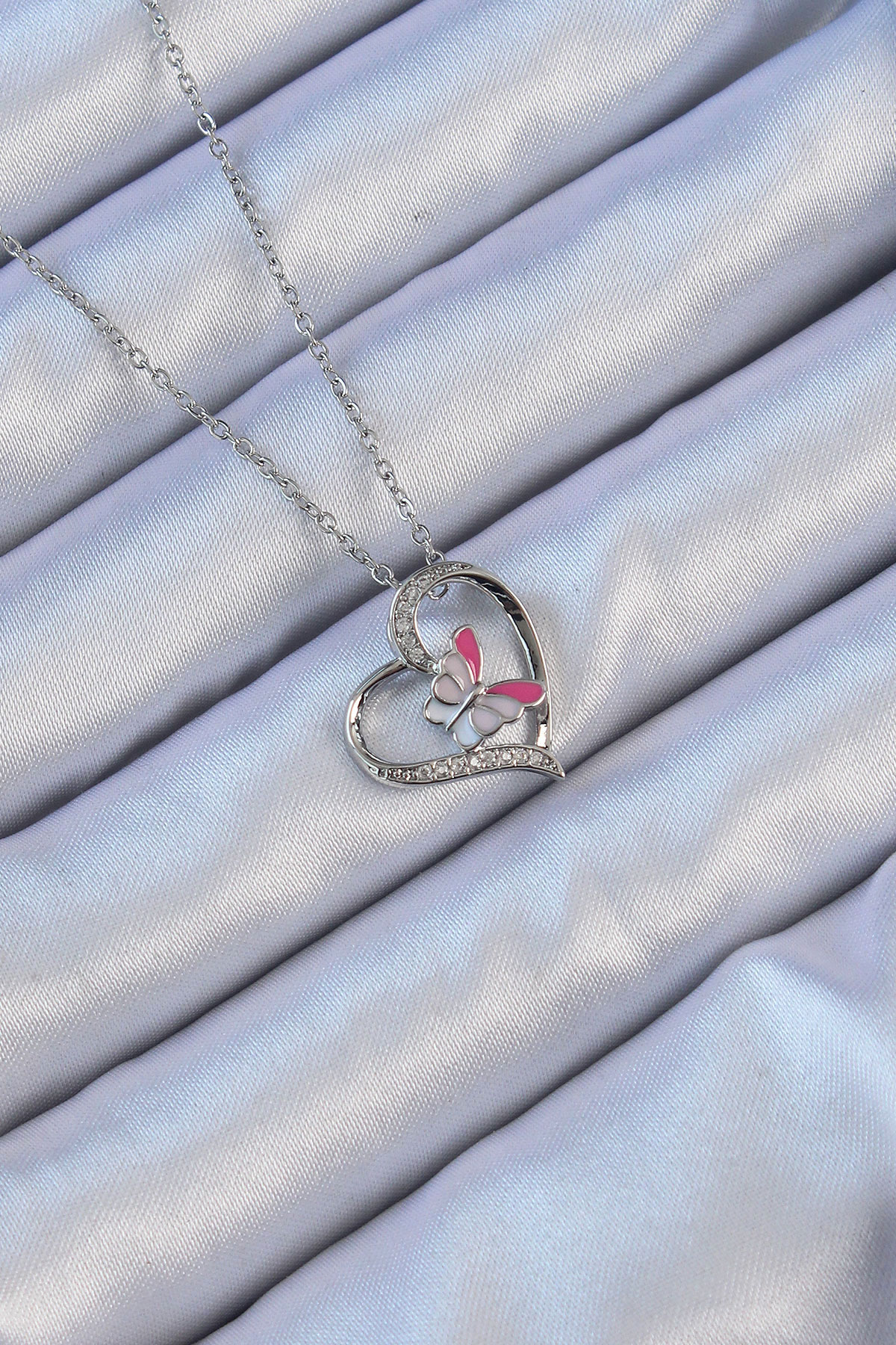316L Çelik Zincir Gümüş Renk Mineli Kelebek Figür Zirkon Taşlı Kalp Kolye - TJ-BKO9108