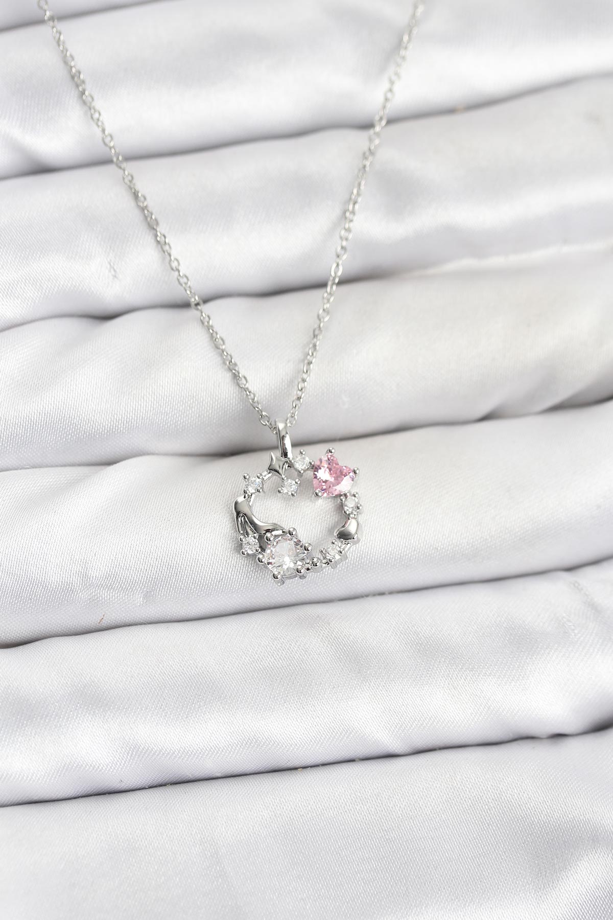 316L Çelik Zincir Gümüş Renk Pembe Taş Detaylı Çelenk Model Kadın Kolye - TJ-BKO10902
