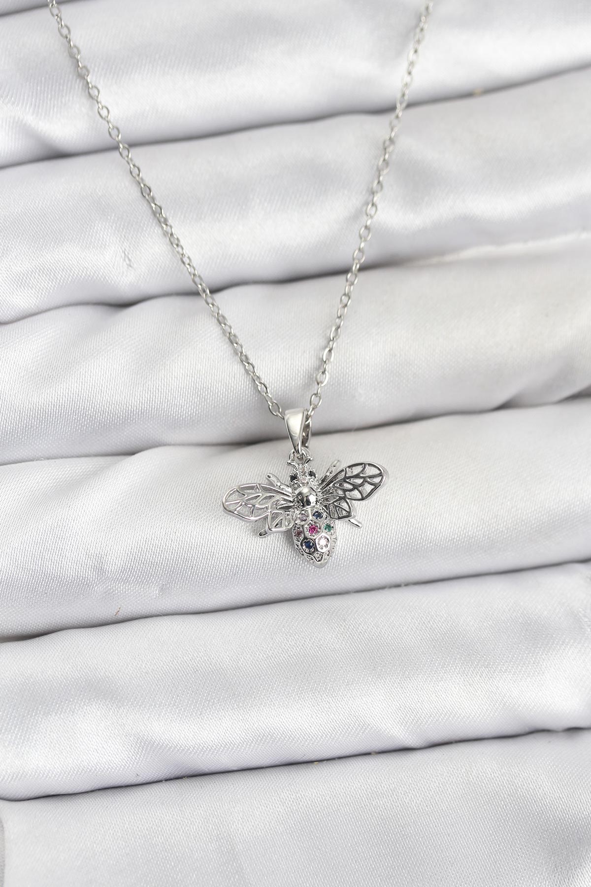 316L Çelik Zincir Gümüş Renk Sinek Model Zirkon Taşlı Kadın Kolye - TJ-BKO10874