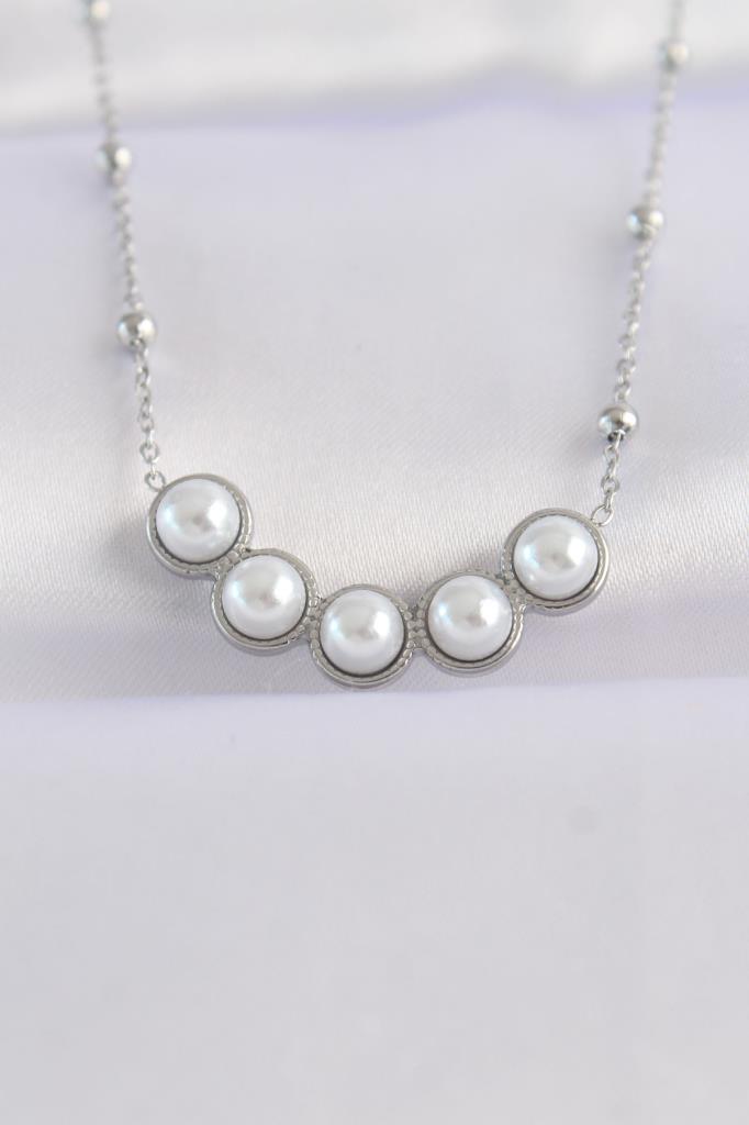 316L Çelik Zincir Gümüş Renk Sıralı İnci Taşlı Kolye - TJ-BKO8654