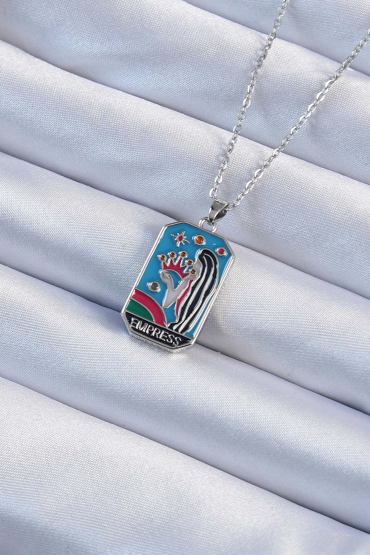 316L Çelik Zincir Gümüş Renk Taç ve Kız Figürlü Renkli Mineli Tarot Kolye - TJ-BKO9230